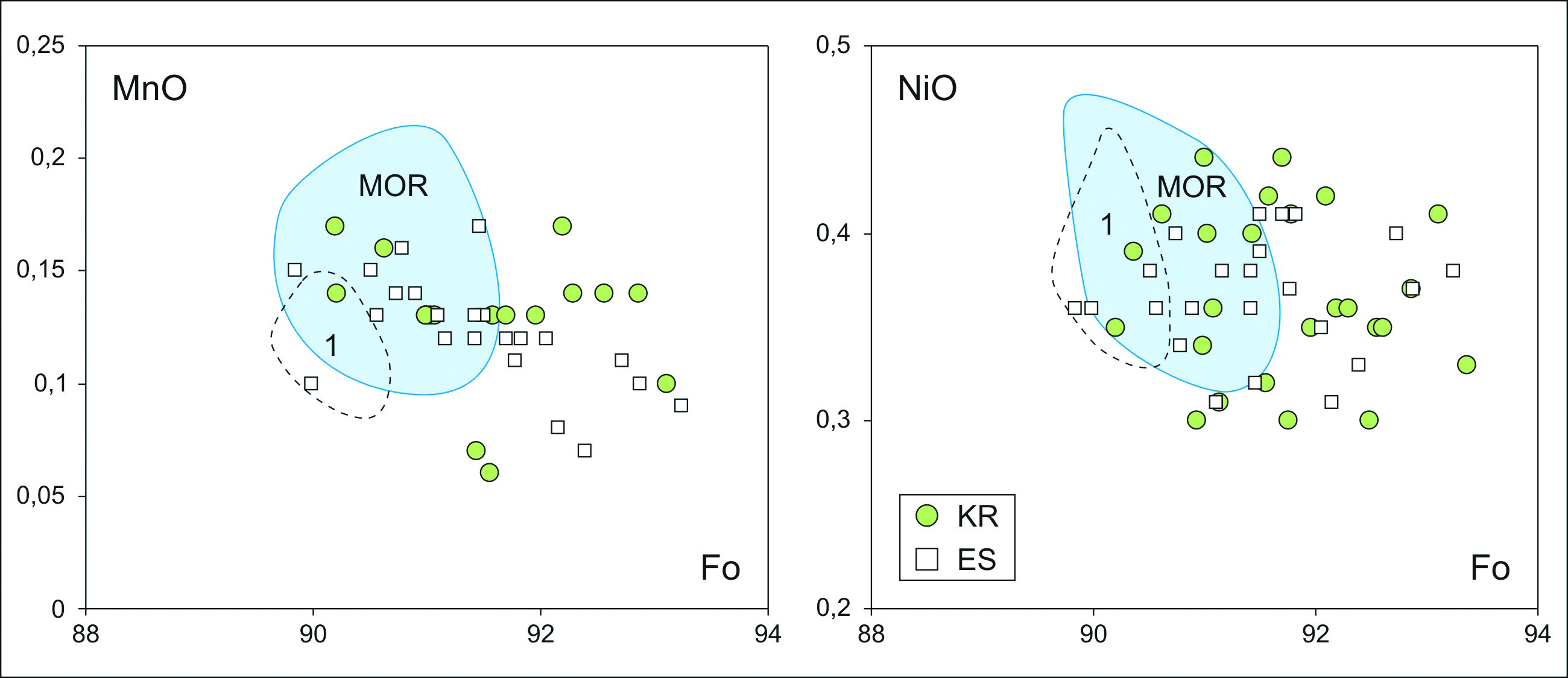 Рис. 3. Состав оливинов из ультрабазитов Куртушибинских офиолитов (KR) и дунитов и гарцбургитов Оспинского массива (Восточный Саян) (ES) на диаграммах MnO–Fo и NiO–Fo. Построено на основе оригинальных данных и материалов из работ (Гончаренко, 1989; Симонов и др., 1999; Анциферова, 2006; Рыбакова, 2019).