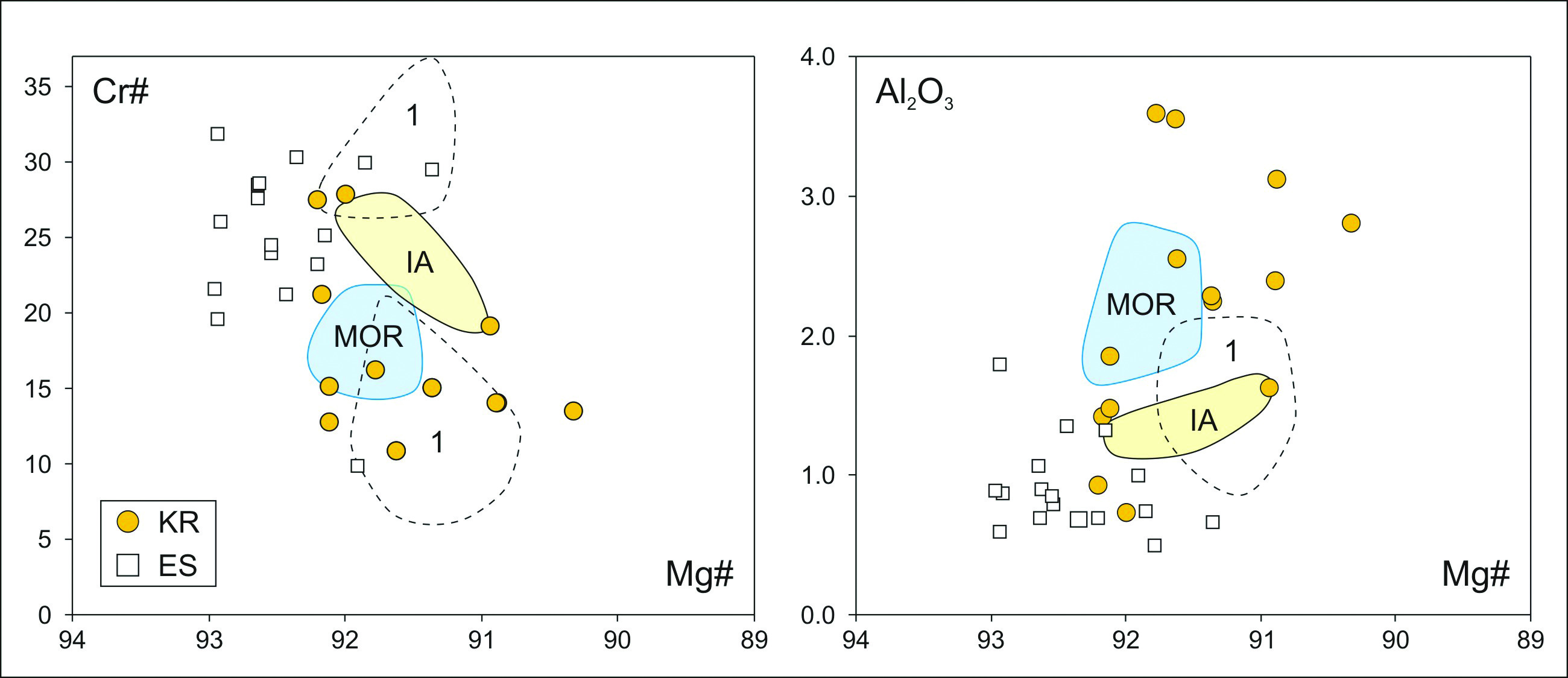 Рис. 5. Состав ортопироксенов из ультрабазитов Куртушибинских офиолитов (KR) и гарцбургитов Оспинского массива (Восточный Саян) (ES) на диаграммах Cr#–Mg# и Al2O3–Mg#. Построено на основе оригинальных данных и материалов из работ (Савельева, 1987; Гончаренко, 1989; Симонов и др., 1999; Анциферова, 2006; Рыбакова, 2019).