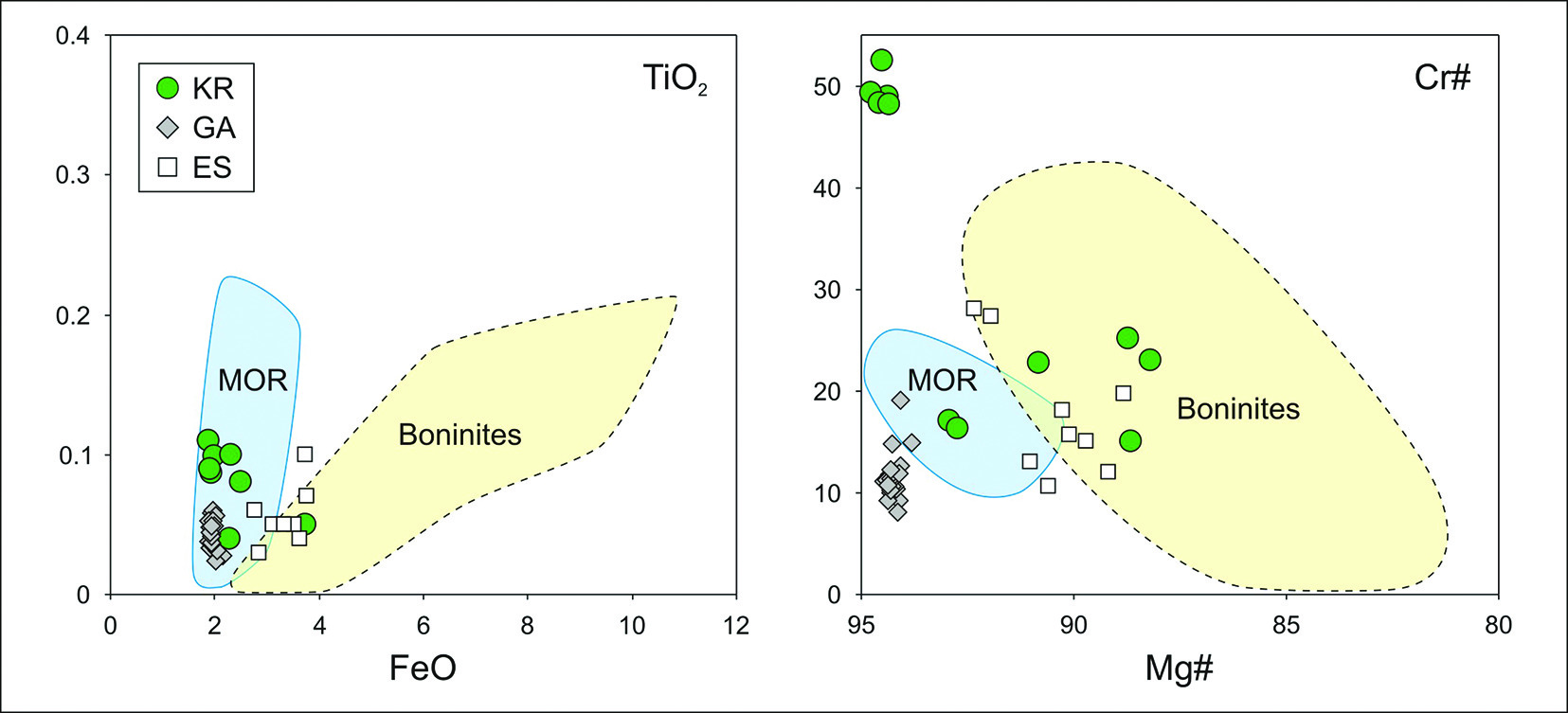 Рис. 6. Состав клинопироксенов из ультрабазитов Куртушибинских офиолитов (KR), пироксенитов Чаган-Узунского массива (Горный Алтай, GA) и пироксенитов и верлитов Оспинского массива (Восточный Саян, ES) на диаграммах TiO2–FeO и Cr#–Mg#. Построено на основе оригинальных данных и материалов из работ (Гончаренко, 1989; Симонов и др., 1994, 1999, 2009; Анциферова, 2006; Brunelly et al., 2006; Kotlyarov et al., 2018).