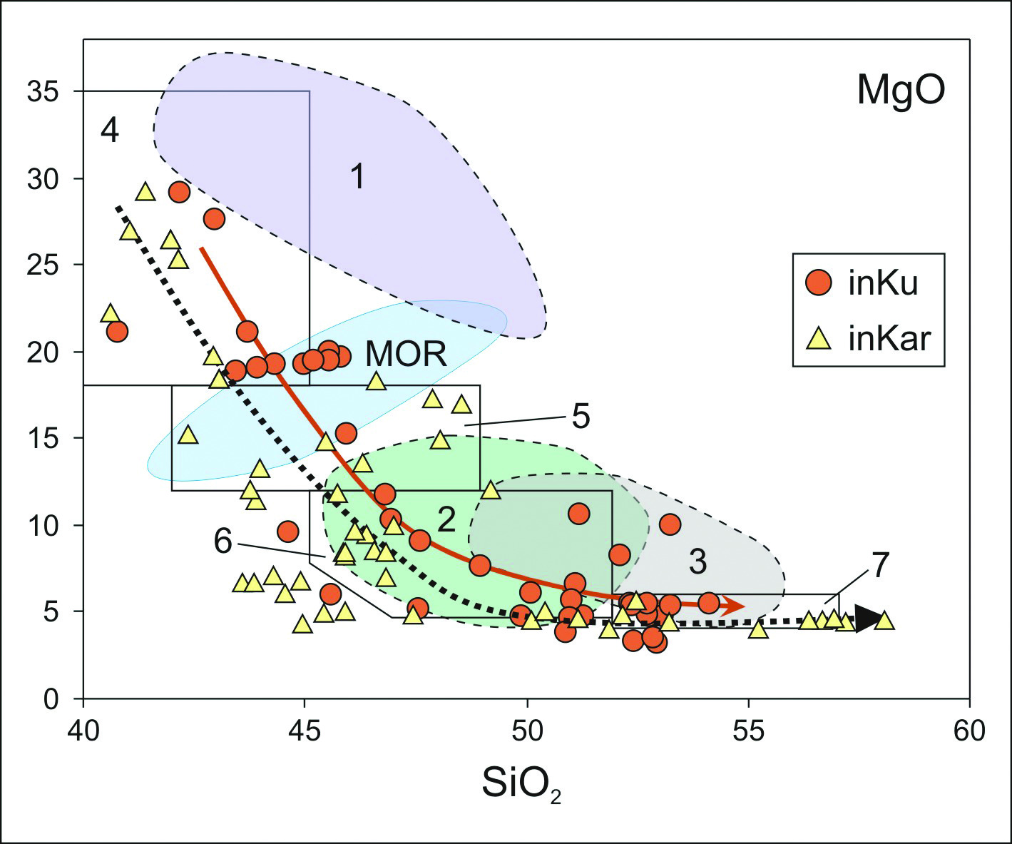 Рис. 8. Состав расплавных включений в хромшпинелидах из дунитов Куртушибинских офиолитов (InKu) и Карашатского массива (InKar) на диаграмме MgO–SiO2. Построено на основе оригинальных данных и материалов из работ (Петрология…, 1977; Магматические …, 1983; Петрографический..., 2009; Симонов и др., 2009).