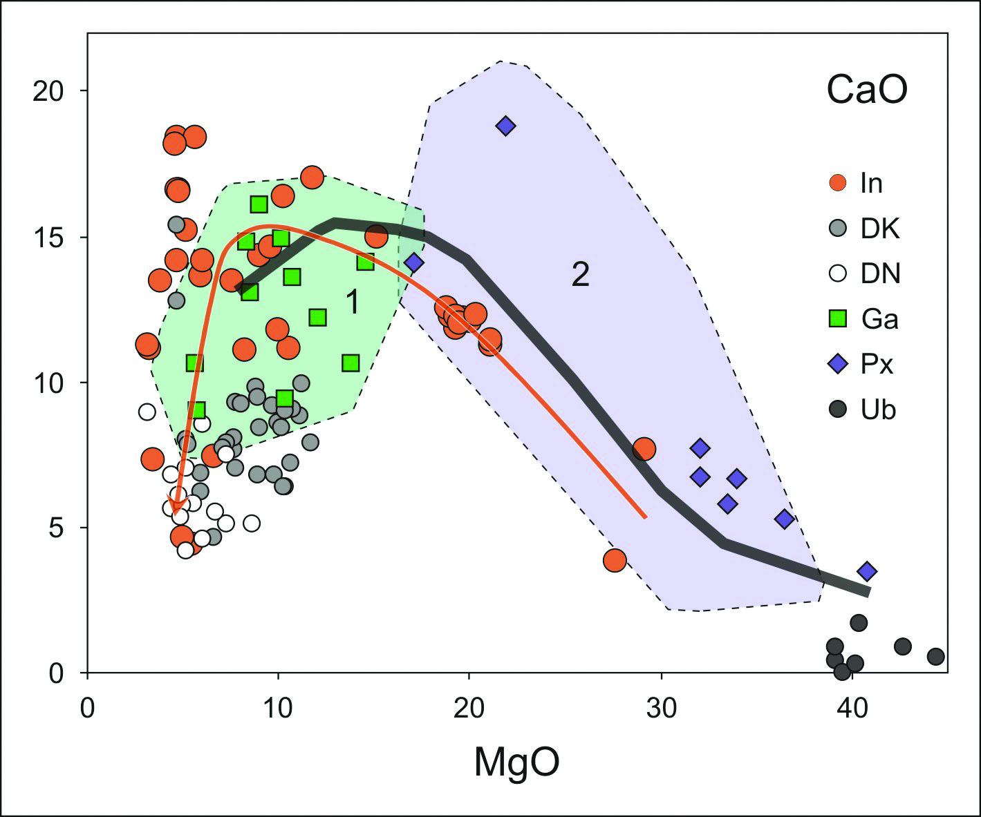 In – расплавные включения в хромшпинелидах из дунитов Куртушибинских офиолитов. Дайки из Куртушибинских (DK) и Северо-Саянских (DN) офиолитов. Габбро (Ga), пироксениты, верлиты (Px), дуниты, гарцбургиты (Ub) Куртушибинских офиолитов. Поля: 1, 2 – габбро (1) и клинопироксениты + верлиты (2) Карашатского офиолитового массива (Южная Тува). Черная линия – расчетный тренд модельных составов пород Карашатского массива. Коричневая линия – тренд расплавных включений в хромшпинелидах Куртушибинских офиолитов.
