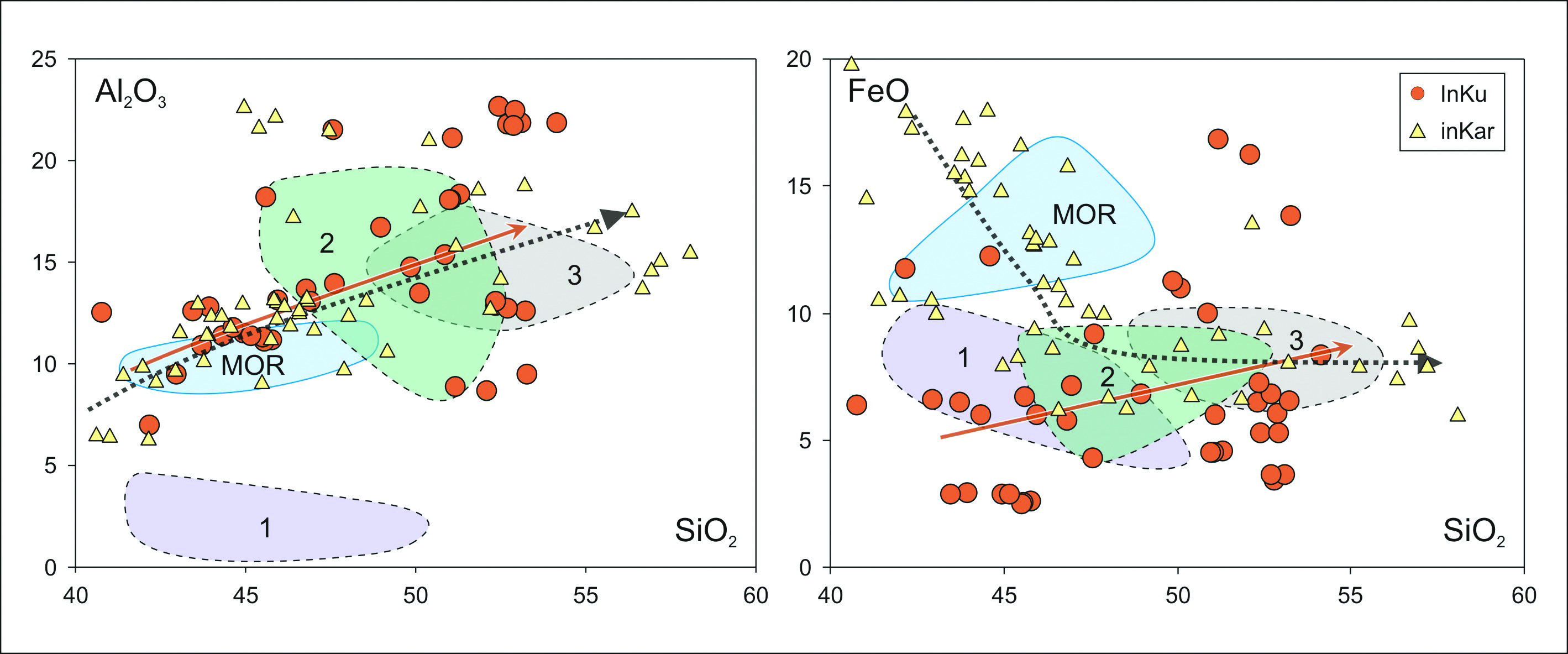 Рис. 10. Состав расплавных включений в хромшпинелидах из дунитов Куртушибинских офиолитов (InKu) и Карашатского массива (InKar) на диаграммах Al2O3–SiO2 и FeO–SiO2. Построено на основе оригинальных данных и материалов из работы (Петрология…, 1977).
