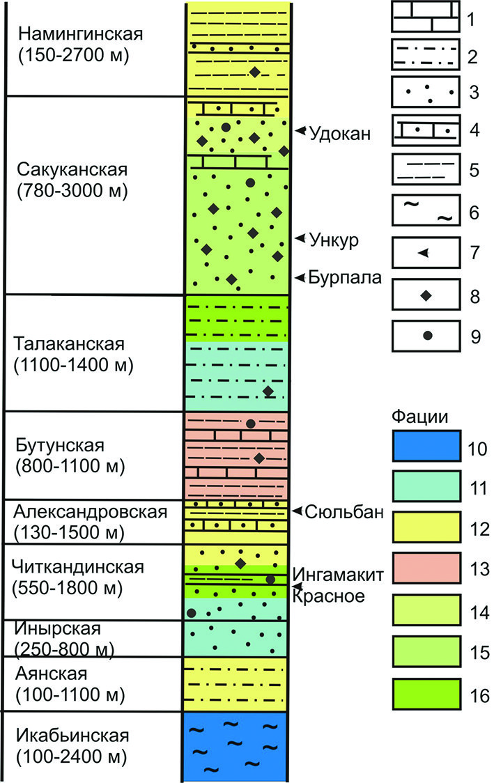 Меденосные горизонты в разрезе удоканской серии встречаются в различных свитах – читкандинской, александровской, сакуканской, намингинской. Литолого-фациальная принадлежность пород, вмещающих медное оруденение, включает в себя образования замкнутых и полузамкнутых бассейнов, а также лагунно-дельтовых образований (рис. 2).