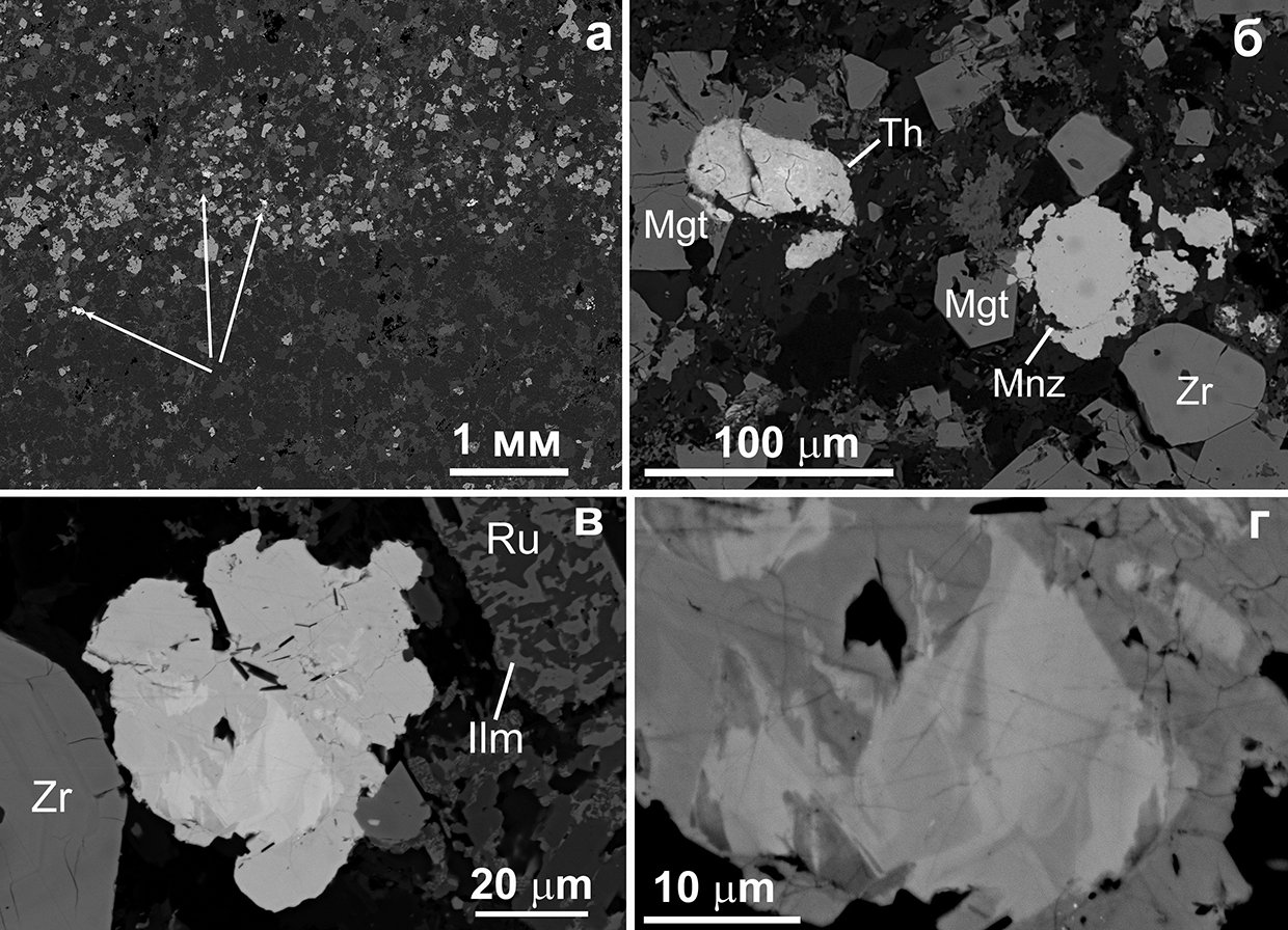 Рис. 5. Морфология «торита» в прослоях, обогащенных оксидами железа, Ункурского месторождения: а – обогащение оксидно-железистых слоев «торитом» и фосфатами РЗЭ (показаны стрелками); б – неоднородное зерно «торита» и монацит (Mnz) среди магнетита и циркона; в – зерно монацита с реликтом неоднородного обломочного зерна в ассоциации с рутил (Ru)-ильменитовым (Ilm) агрегатом и обломочным цирконом; г – деталь рис. в.