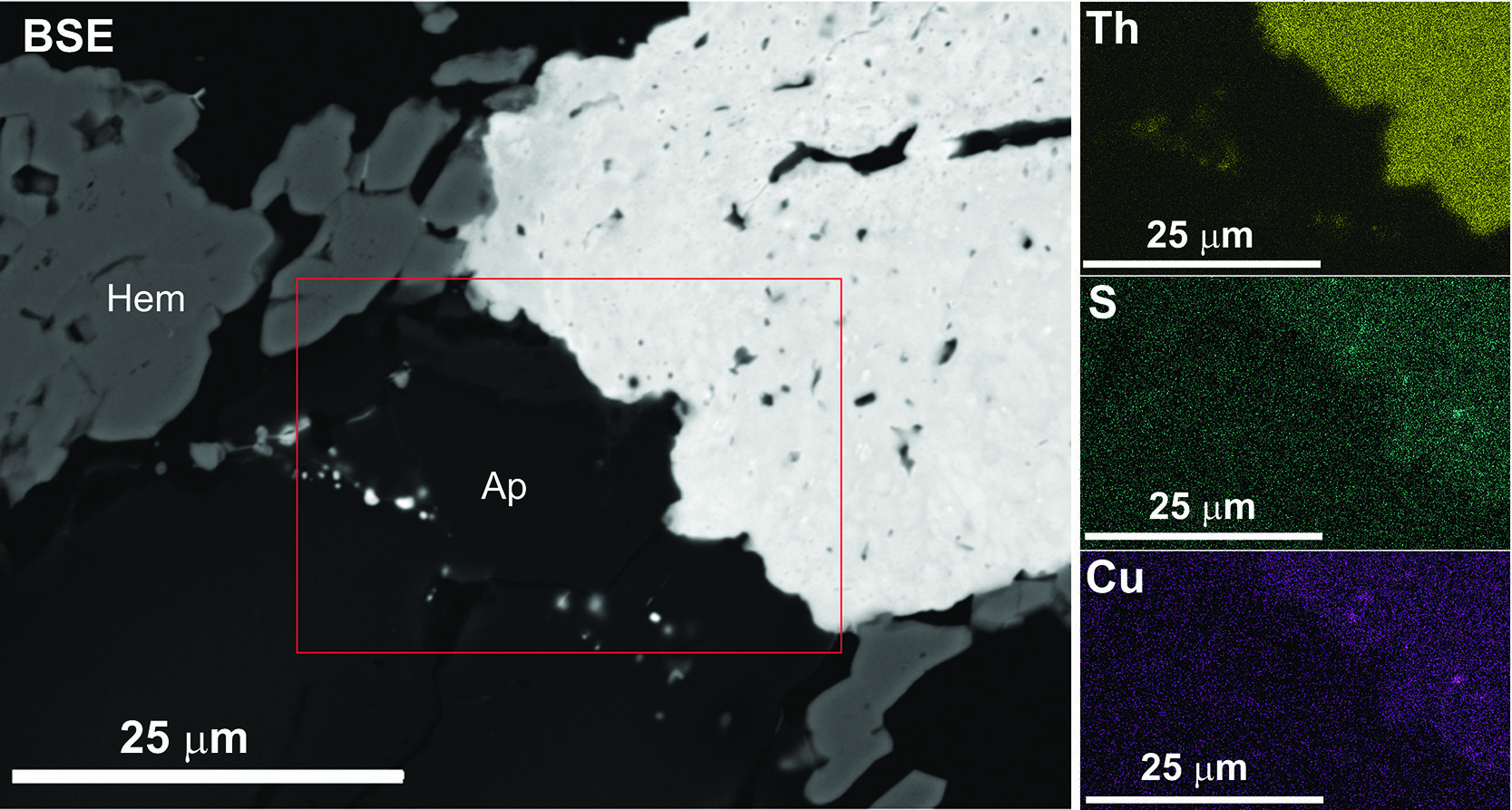 Синхронность образования силикатов Th, как минимум, с частью сульфидов Cu, подтверждается 1) обогащением торита Cu, 2) наличием микровключений сульфида Cu в торите.