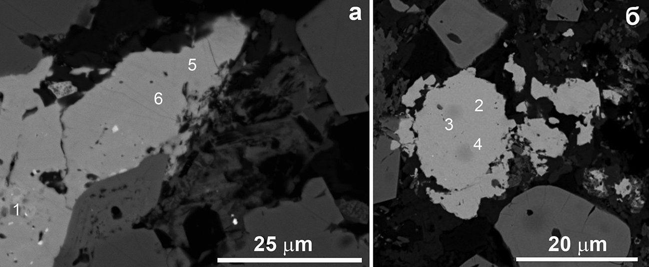Силикат Th («торит») в породах как Удоканского, так и Ункурского месторождений образует неоднородные зерна сложной формы размером до 50–60 мкм, преимущественно, в интерстициях между другими минералами. Обычно «торит» приурочен к перекристаллизованному цементу прослоев, обогащенных оксидами железа (рис. 4, 5).