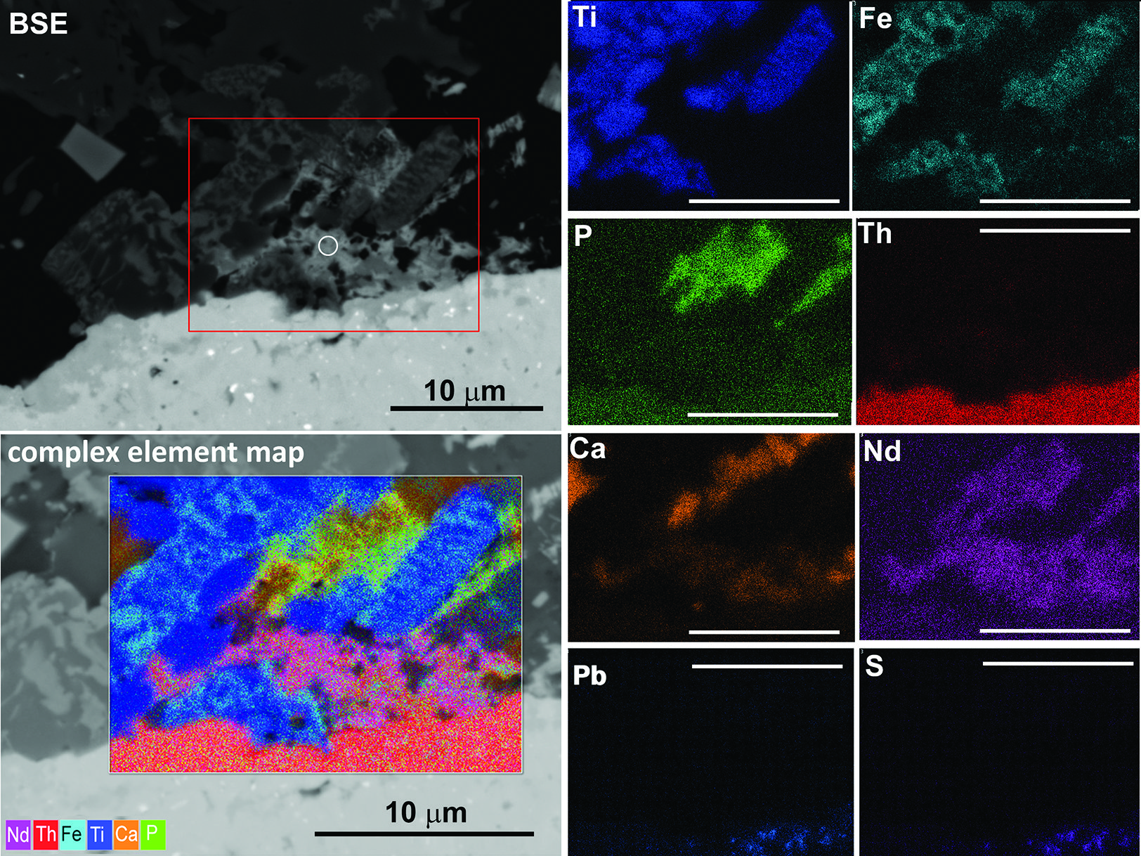 Рис. 12. BSE изображение аутигенных фосфатов и карбонатов (?) РЗЭ в интерстициях рутил-ильменитовых агрегатов на контакте с зерном торита с включениями сульфида свинца и карты распределения элементов. Ункурское месторождение. Масштабная линейка на всех картах – 10 мкм. Кружком отмечена область, для которой получен химический состав, указанный в тексте.