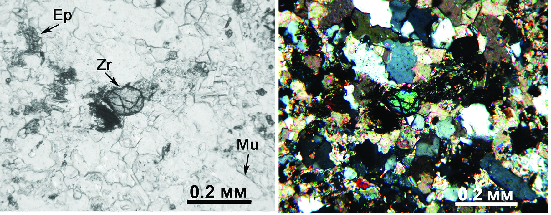 Оптические исследования проводились с помощью поляризационного микроскопа AxioScope A.1 с цифровой приставкой. Содержания РЗЭ, Y, Th и U в песчаниках были определены методом ИСП-МС на масс-спектрометре Agilent 7700x с программным обеспечением MassHunter и стандартом SGD-2a в ЮУФНЦ МиГ УрО РАН, аналитик К.А. Филиппова.