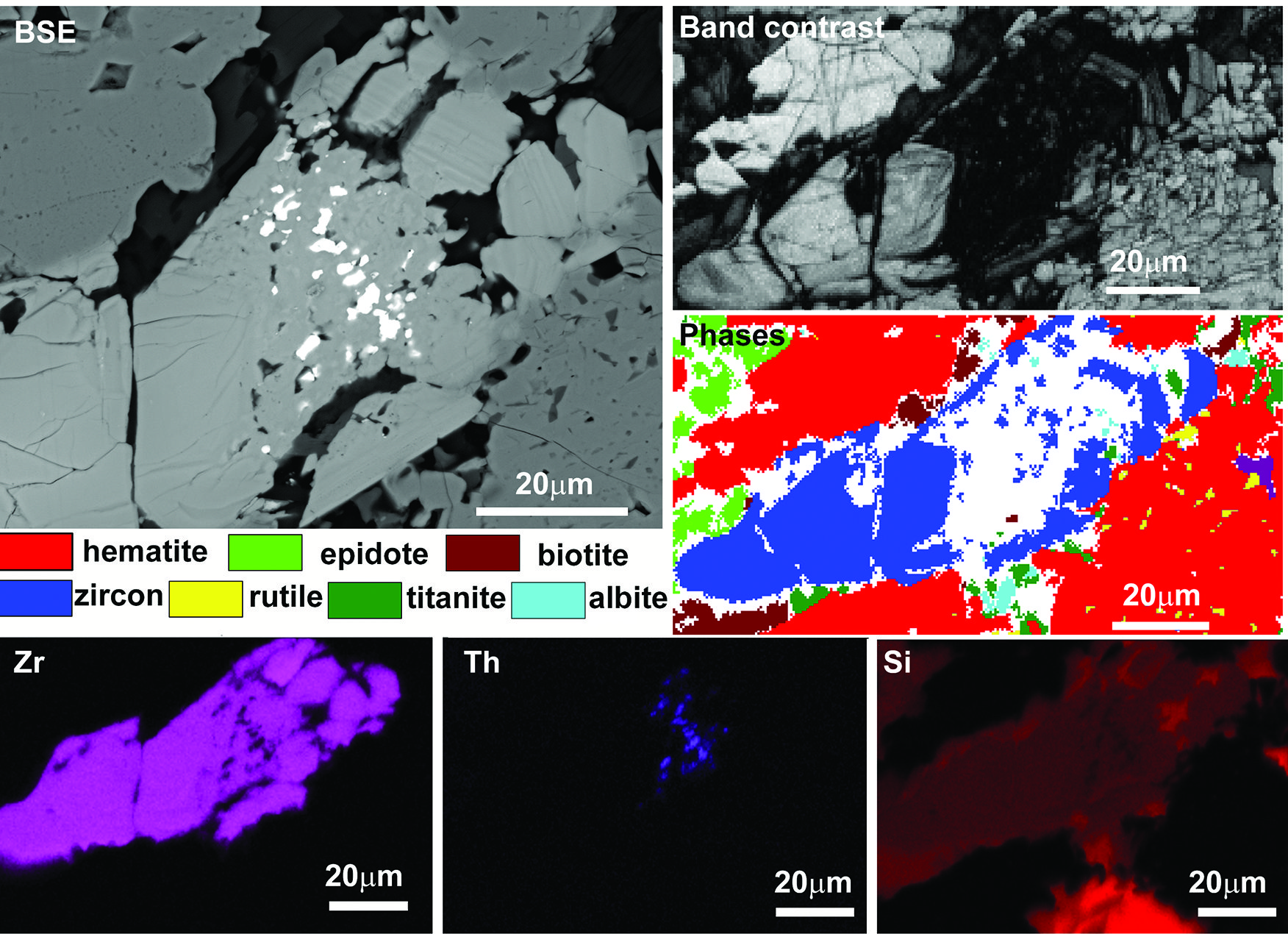 Рис. 14. Частично метамиктный циркон в прослое, обогащенном оксидами железа. BSE изображение, EBSD картины (контраст полос (Band contrast), распределение кристаллических фаз (Phases)) и распределение основных элементов. Шаг сканирования для получения картины EBSD 0.5 мкм. Удоканское месторождение.