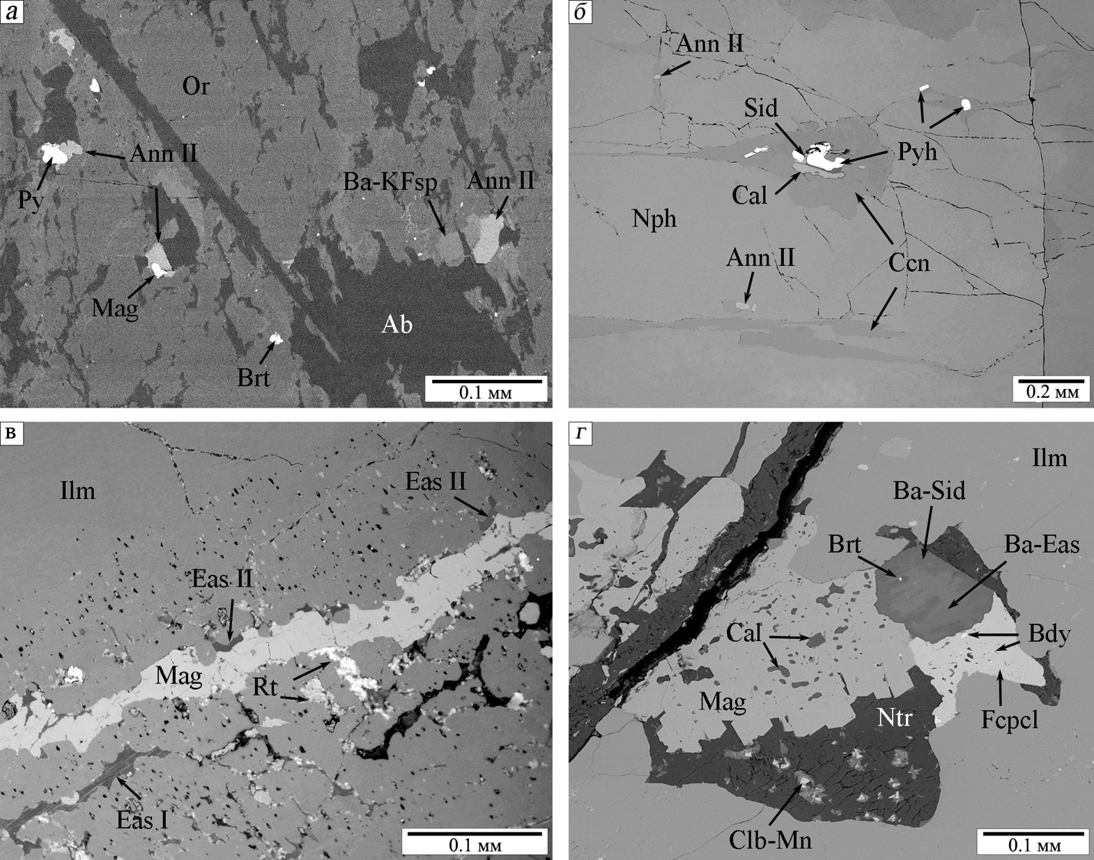 Fig. 2. Late mineral assemblages in calcite-nepheline-feldspar pegmatites: a – replacement of orthoclase crystal (Or) by albite (Ab), Ba-bearing potassium feldspar (Ba-KFsp), annite II (Ann II), pyrite (Py), magnetite (Mag ) and barite (Brt); б – annite II and intergrowth of siderophyllite (Sid), calcite (Cal), fluorite and pyrrhotite (Pyh) in a cancrinite vein (Ccn) of nepheline pegmatite (Nph); в – eastonite I and II (Eas) in assemblage with magnetite and rutile (Rt) in ilmenite aggregate (Ilm); г – Ba-bearing eastonite (Ba-Eas), Ba-bearing siderophyllite (Ba-Sid), fluorcalciopyrochlore (Fcpcl), baddeleyite (Bdy), magnetite, natrolite (Ntr) and columbite-(Mn) (Clb-Mn) in cavity of Mn-bearing ilmenite nodule.