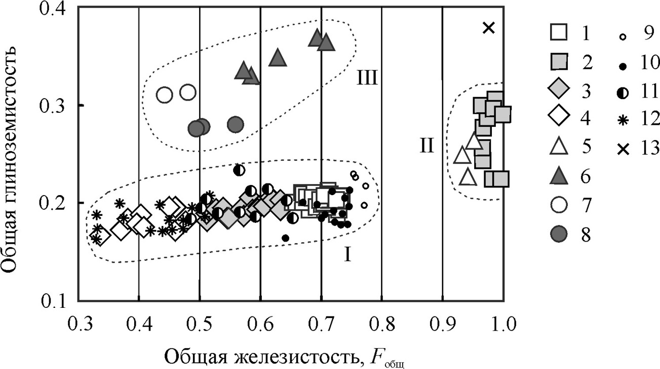 1, 2 – micas from mine no. 125: 1 – annite I, 2 – annite II; 3, 4 – micas from mine no. 16: 3 – annite, 4 – phlogopite; 5 – siderophyllite; 6 – Вa-bearing siderophyllite; 7 – eastonite; 8 – Вa-bearing eastonite; 9 – annite from carbonatite of the Vishnegogorsky miaskite block, ore zone no. 147; 10 – annite from syenite, miaskite and miaskitic pegmatite of the Ilmeny-Vishnevogorsky carbonatite-miaskite complex (Levin, 1974; Levin, Kutepova, 1974); 11 – annite-phlogopite mica from carbonatite I of the Central alkaline band of the complex; 12 – phlogopite from melanocratic carbonate-silicate rocks of the Central alkaline band of the complex; 13 – siderophyllite from corundum miaskitic pegmatite (Rassomakhin et al., 2020); I, II, III areas, see text for explanation; 9, 11, 12 – materials of (Levin et al., 1997).