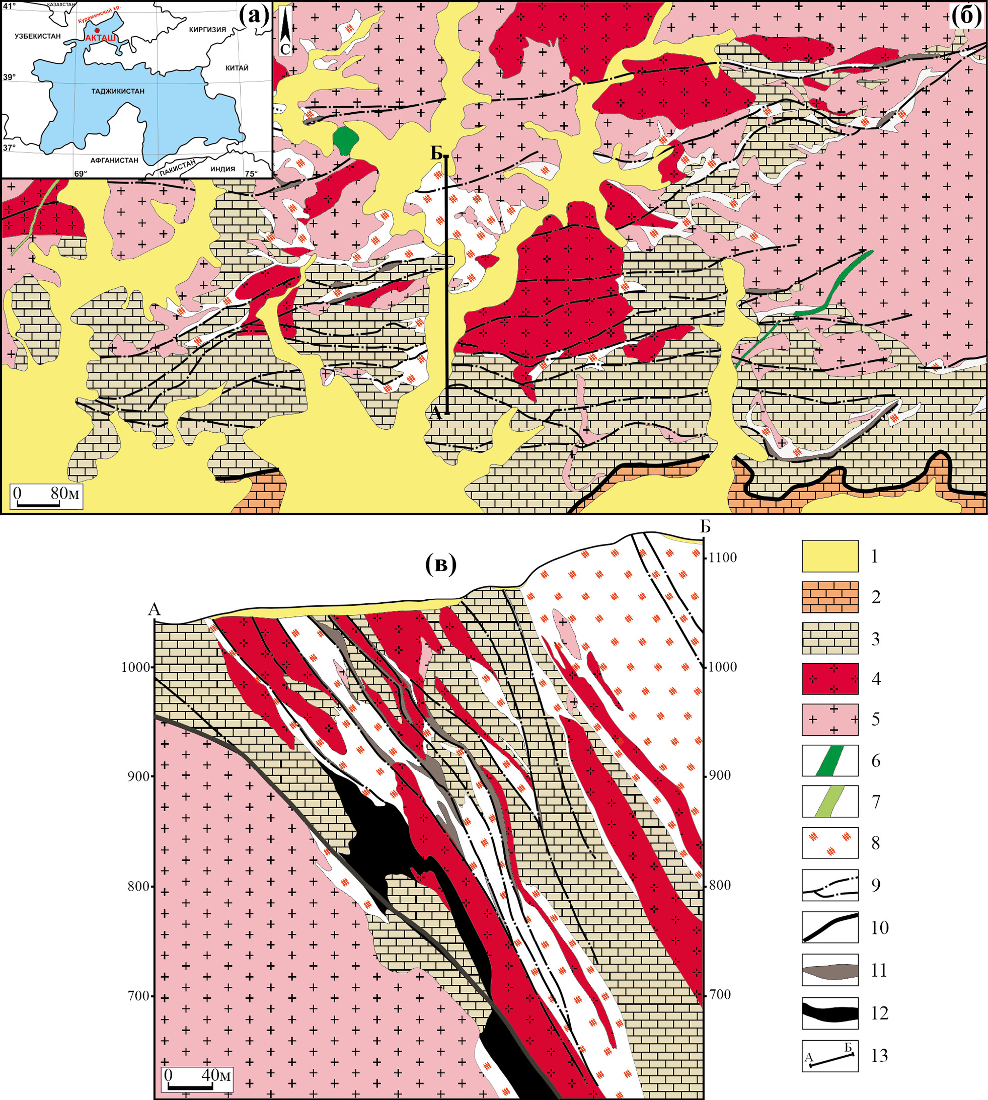 Fig. 1. Geographical position (a), geological structure (б) and geological section A–Б (в) of the Aktash deposit, simplified after (Fakhridinov et al., 1974).
