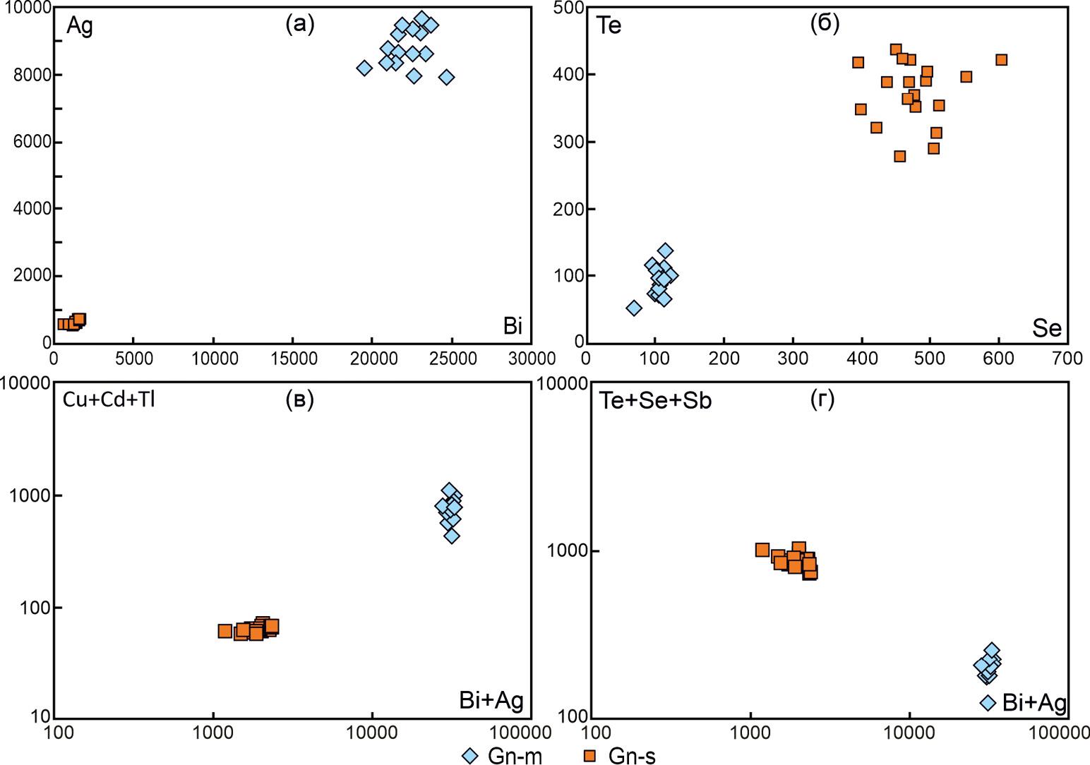 Fig. 3. Ag–Bi (а), Te–Se (б), Cu + Cd + Tl–Bi + Ag (в) and Te + Se + Sb–Bi + Ag (г) correlations in galena of the Aktash deposit (ppm).