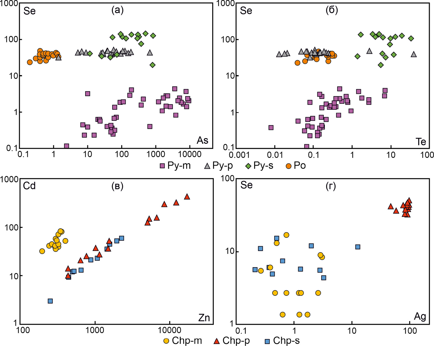 В структуре пирита и пирротина в определенных количествах изоморфно могут замещать Fe и S следующие элементы: Co, Ni, Mn, Cu, Zn, Ge, As, Sb, Au, Ag, Se, Te (Reich et al., 2013; Deditius et al., 2014). В нашем случае, подавляющее большинство элементов-примесей, судя по результатам кластерного анализа, изоморфно входят в структуру пирита и пирротина (рис. 7в). В халькопирите только Ag, Pb, Zn, As, Se и Co обычно упоминаются как изоморфные примеси, а Mn, Tl, In, Ga и Hg встречаются редко и в низких концентрациях (George et al., 2018). Возможно, в составе халькопирита Ag, Se, As, Ge, Co, Ni, Tl, In, Ga и V присутствуют изоморфно, а повышенные содержания Pb, Sb, Te, Zn, Cd, Mn, Hg, Bi и Au обеспечиваются благодаря микровключениям галенита, сфалерита, самородного золота и висмута. Ровные тренды ЛА-ИСП-МС и отсутствие аномальных пиков Se, характерных для микровключений, указывают на вхождение Se в структуру халькопирита в изоморфной форме.