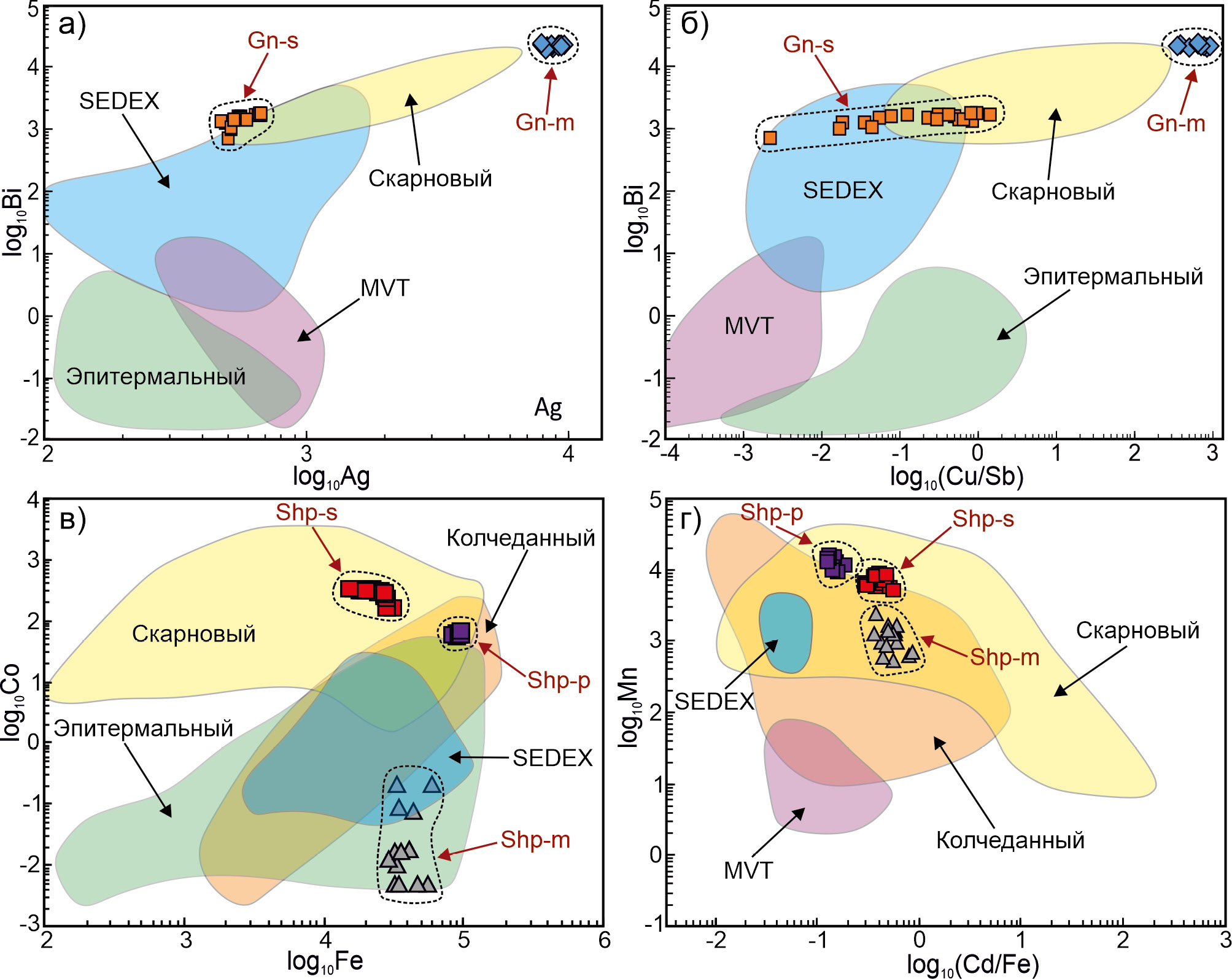 Groups (clusters) of elements are marked with colors. a – galena; б – sphalerite; в – pyrite and pyrrhotite; г – chalcopyrite.