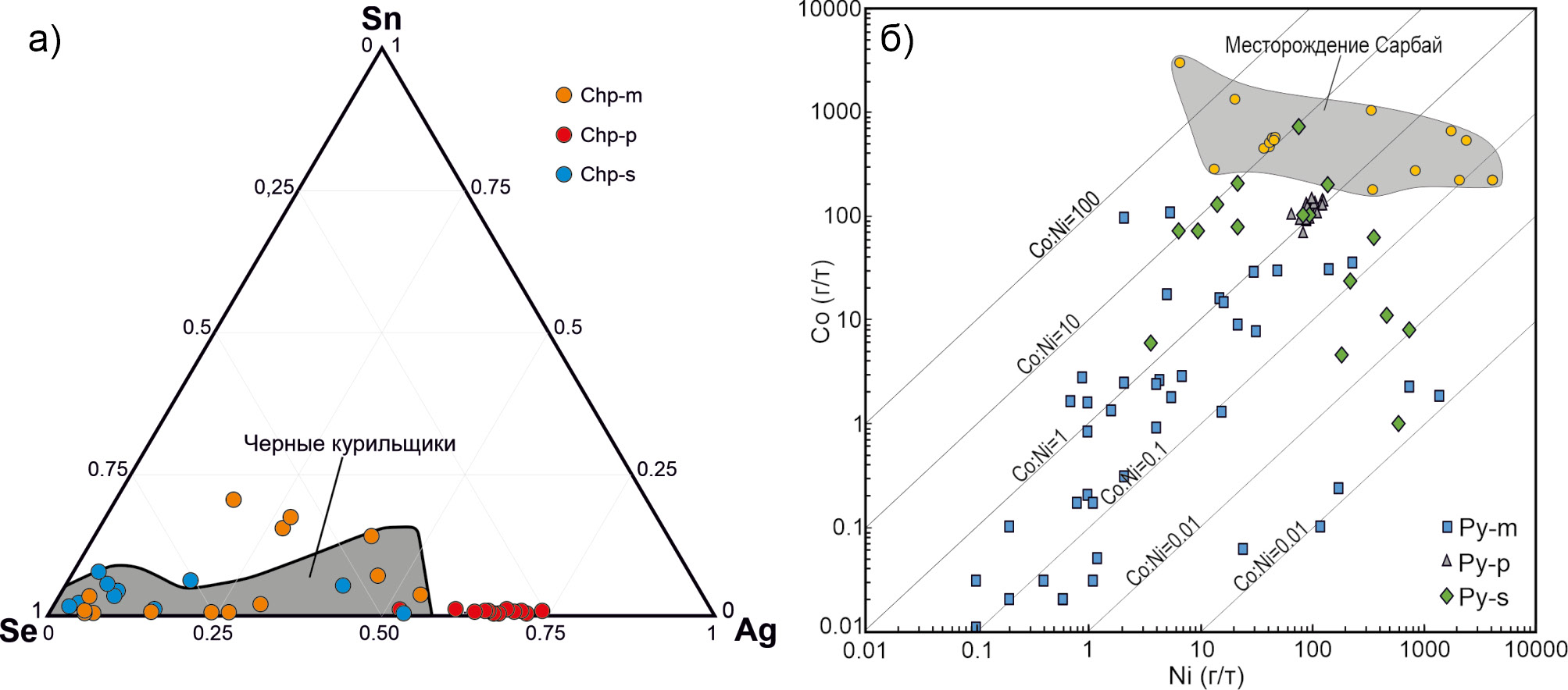 Fig. 7. Se-Ag-Sn plot for chalcopyrite (a) and Co-Ni plot for pyrite (б) of the Aktash deposit.
