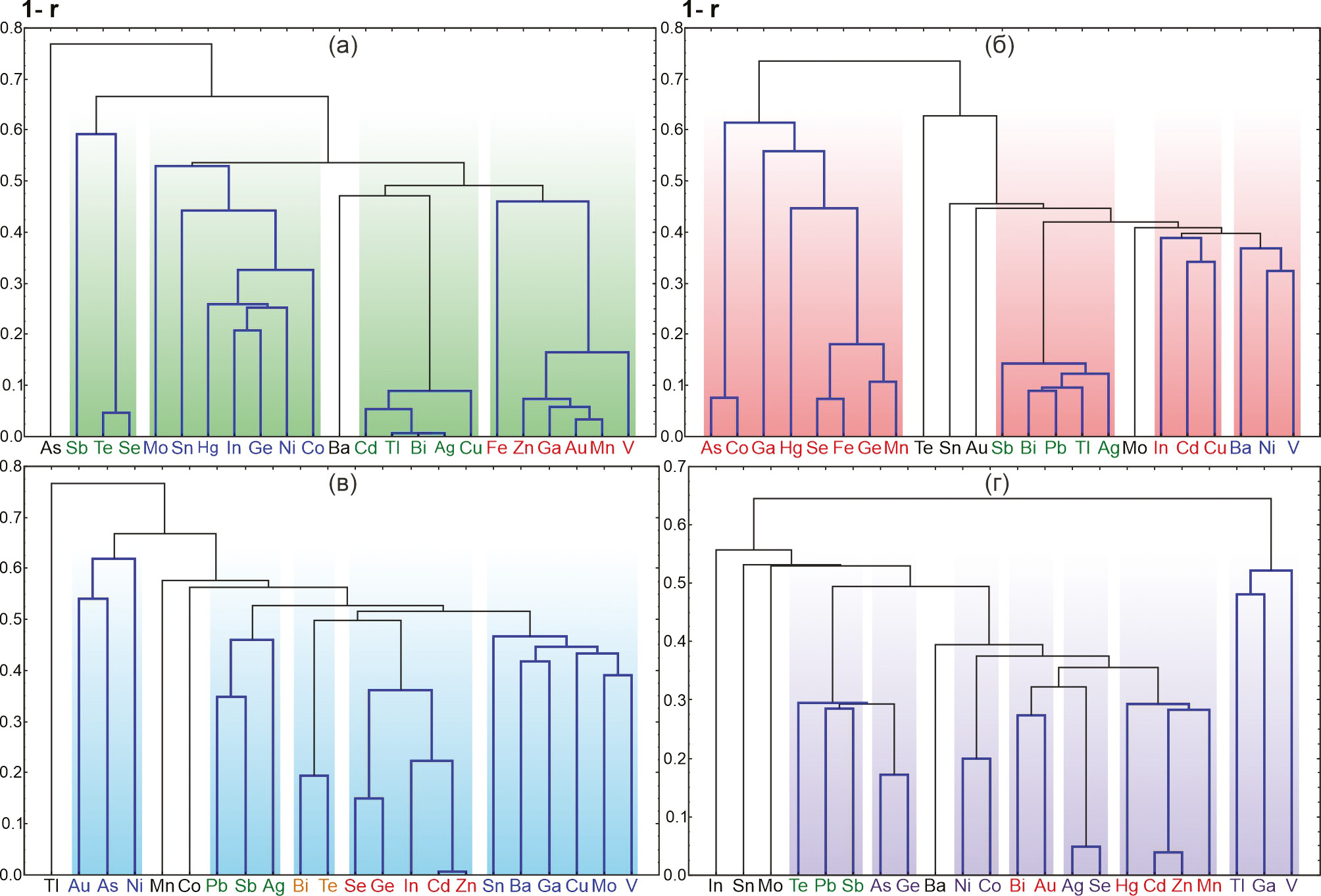 Цветами выделены группы (кластеры) элементов. а – галенит; б – сфалерит; в – пирит и пирротин; г – халькопирит.