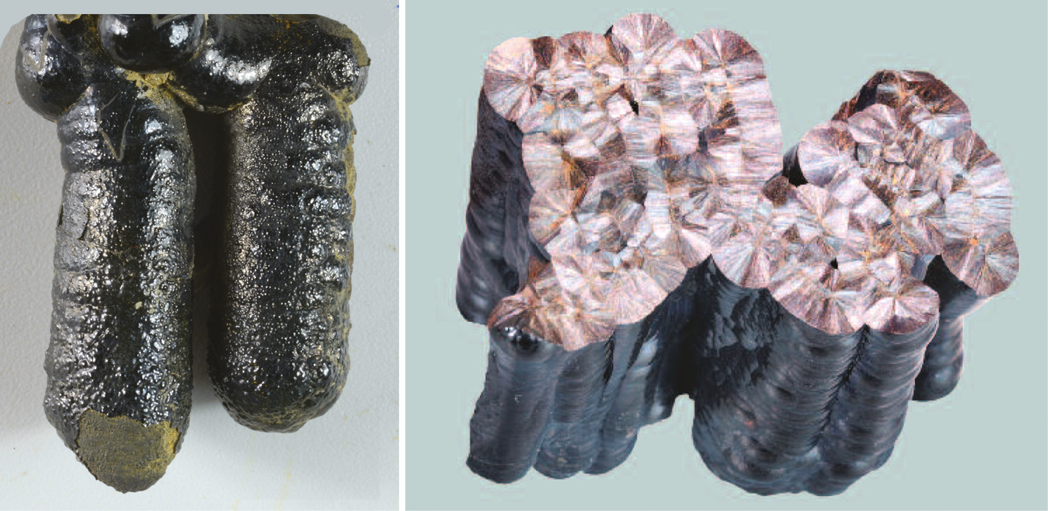Fig. 2. Goethite stalactites (left) and cross-section of an intergrowth of goethite stalactites (right). Mednorudyanskoe deposit. Photo by M. B. Leibov.