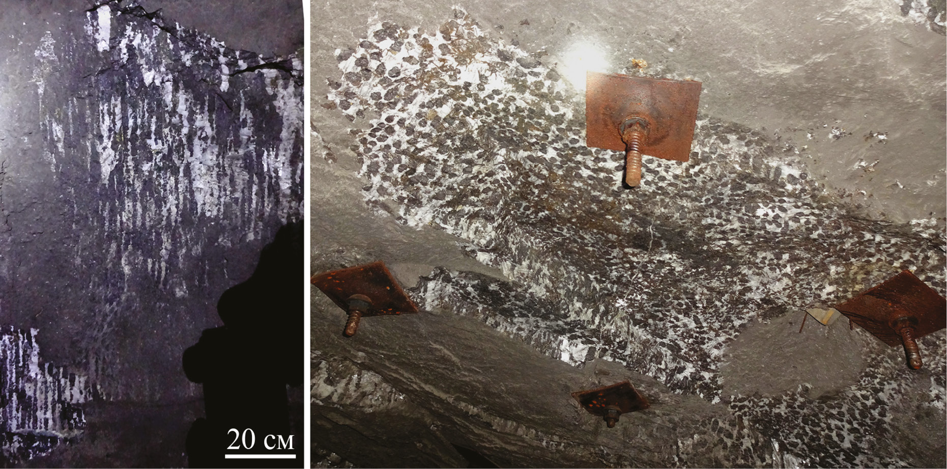 Рис. 4. Магнетитовые сталактиты в кальцитовом агрегате в горной выработке: слева – вертикальная стенка, справа – потолок с креплением. Фото М. В. Цыганко.
