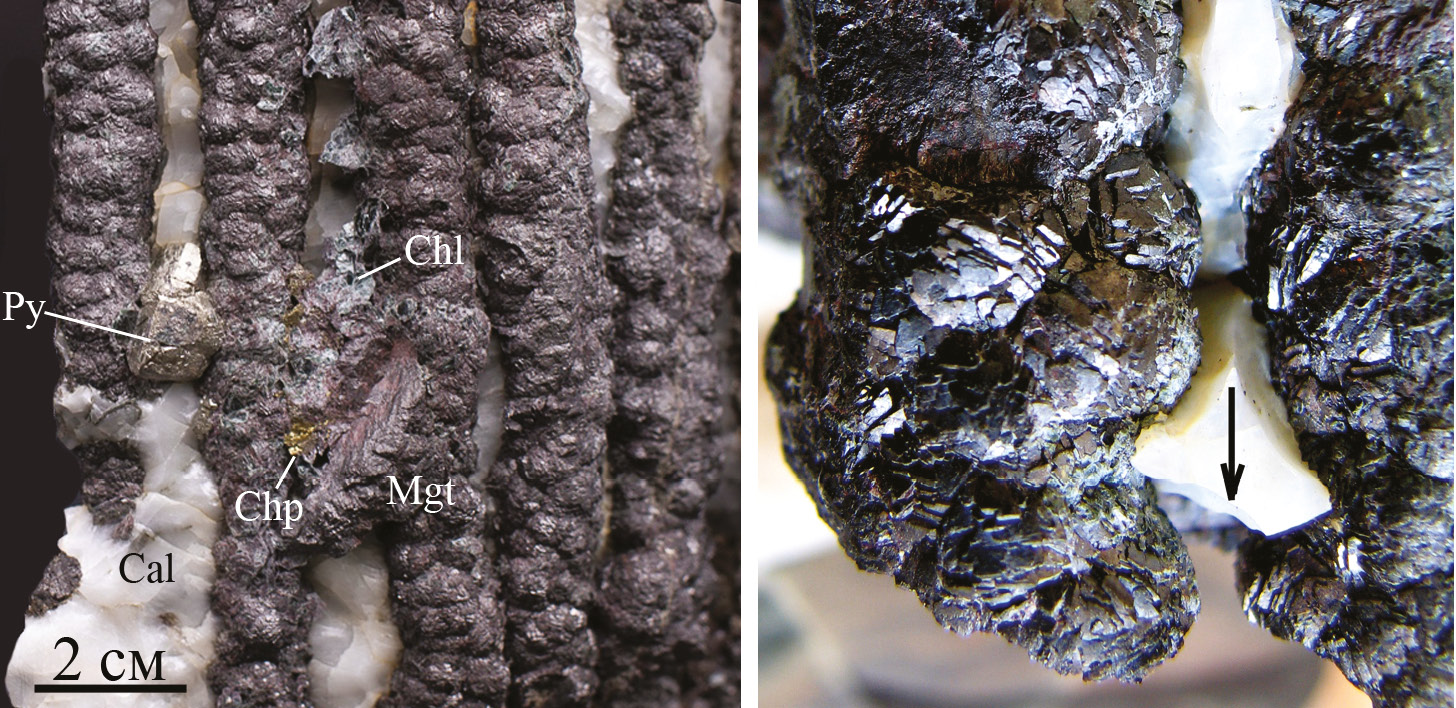 Fig. 5. Details of the structure of magnetite stalactites: left – rare ingrowths of pyrite (Py), chalcopyrite (Chp) and chlorite (Chl) in aggregate of split magnetite stalactites; right – the lower parts of stalactites in form of aggregates of split and blocky octahedra of magnetite. Arrow – flow direction. Photo by M.V. Tsyganko and V.A. Popov.