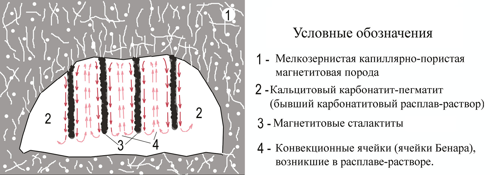 Для построения модели формирования текстуры минерального агрегата важны следующие соображения: 1) минералообразование происходило в полости, возникшей в крупном теле мелкозернистого магнетита (см. схему на рис. 6); 2) полость и капиллярно-пористая система вокруг полости были заполнены карбонатитовым расплавом-раствором при температуре выше его температуры плавления; 3) в стационарном состоянии (некоторое время) в такой системе формируются конвективные потоки, связанные с разной плотностью растворов в капиллярах и в полости; 4) если в более плотных слоях потоков возникнет пересыщение по отношению к каким-либо минералам, может возникнуть кристаллическое тело, наследующее вертикальное движение потока в гравитационном поле.