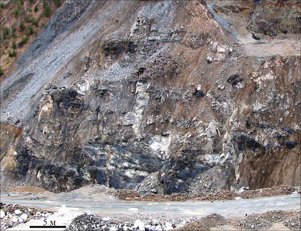 Fig. 7. Carbonatite bodies (light) among magnetite bodies (dark) in the ledge of the quarry of the Mednorudyansk deposit. 2013. Photo by V.A. Popov.