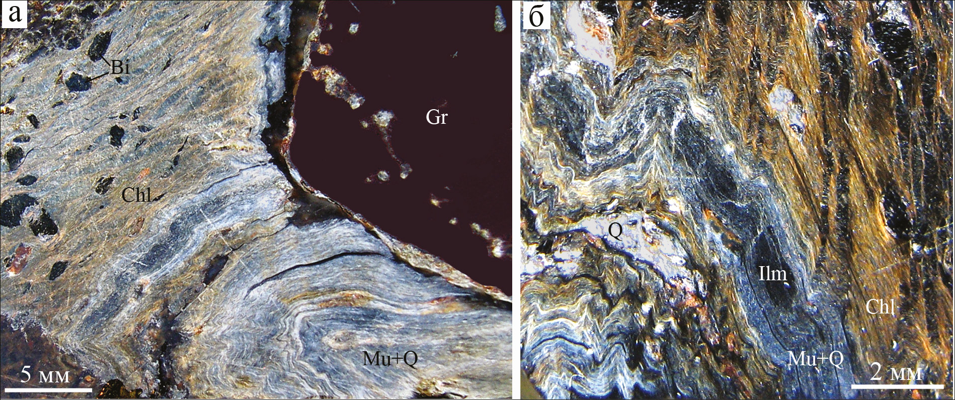 Chl – хлорит, Bi – биотит, Mu – мусковит, Q – кварц, Ilm – ильменит. Косое освещение.
