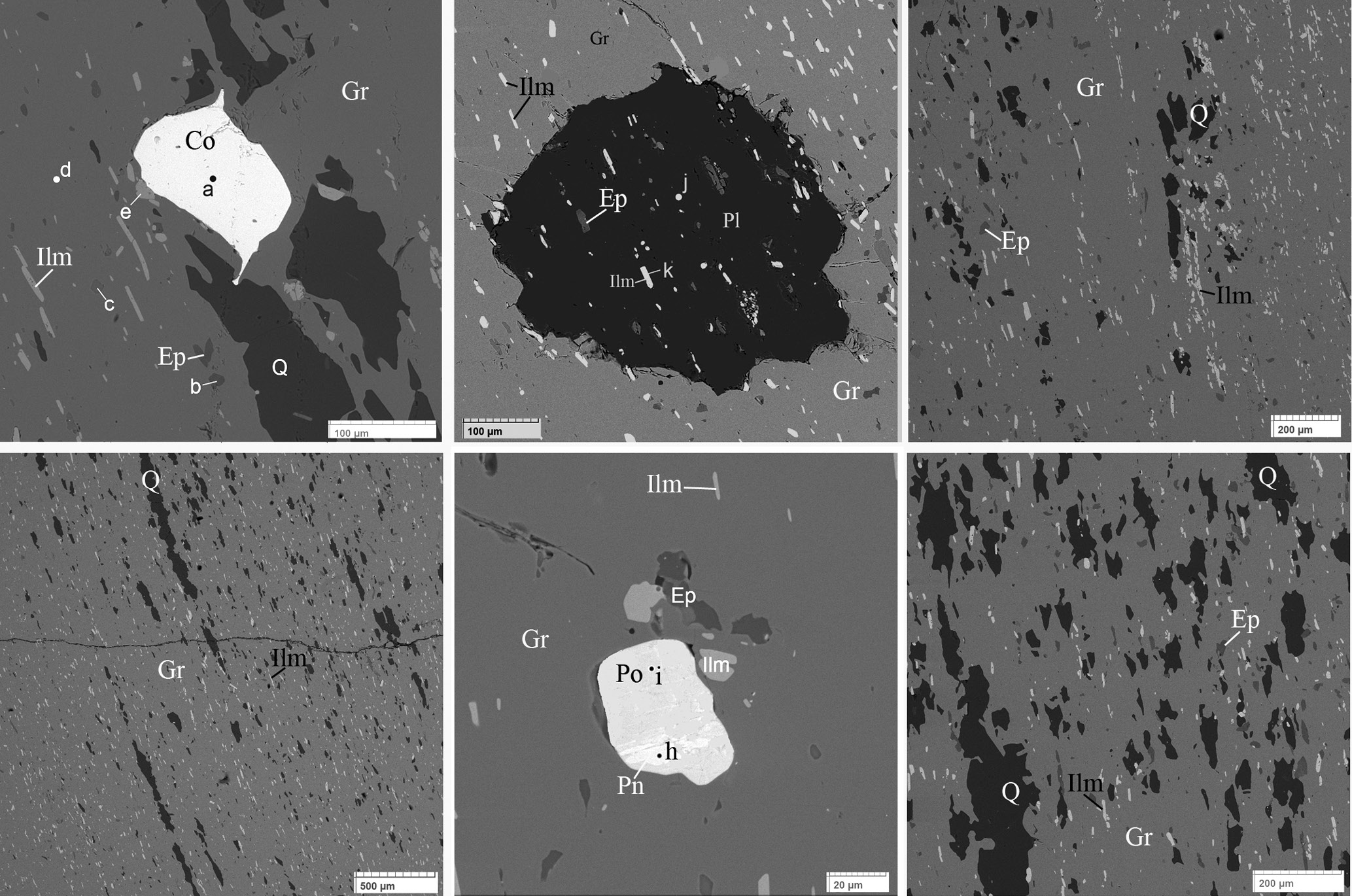 Рис. 6. Разновозрастные включения минералов в метакристаллах альмандина (Gr): ранние – ильменит (Ilm), эпидот (Ep) и частично кварц (Q); синхронные с гранатом – кобальтин (Co), пирротин (Po), пентландит (Pn), плагиоклаз (Pl) и регенерационный кварц. Буквами обозначены точки анализов.