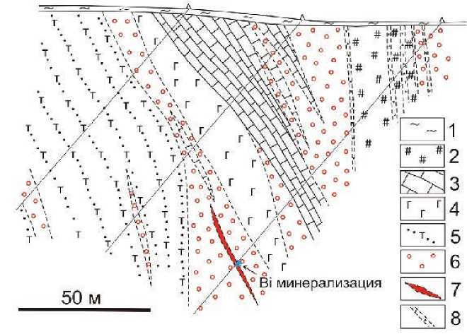 Рис. 3. Геологический разрез Назаровского месторождения, по полевым материалам. 1 – покровные отложения; 2 – гематитовые руды; 3 – известняки; 4 – лавы основного состава; 5 – вулканогенно-обломочные породы основного состава; 6 – скарны; 7 – сульфидные руды; 8 – зоны дробления.