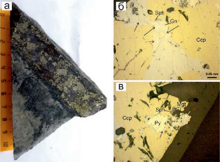 Рис. 5. Морфология висмутовых минералов: а – образец с висмутовой минерализацией; б – сростки халькопирита (Ccp) с галенит (Gn)-висмутовыми (стрелки) минералами и сфалеритом (Sph); в – сростки галенита с висмутовыми минералами (черная стрелка) по контуру кристалла пирита (Py) и на контакте халькопирита (Ccp) с жильными минералами. В халькопирите и айкините (белая стрелка) включения магнетита (Mgt) и сфалерита (Sph). Рис. а – полированный образец; б, в – отраженный свет.