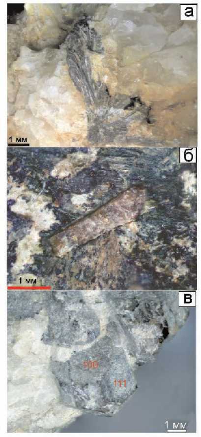 Fig. 2. Morphology of zircon from pegmatite of the Mt Ploskaya deposit: a – fan-shaped intergrowths of type 1 crystals in quartz-albite aggregate; б – type 1 long-prismatic crystal in fluorite aggregate (purple) with albite ingrowths (white); в – type 2 short-prismatic crystal with combination of {100} and {111} faces in quartz-albite aggregate.