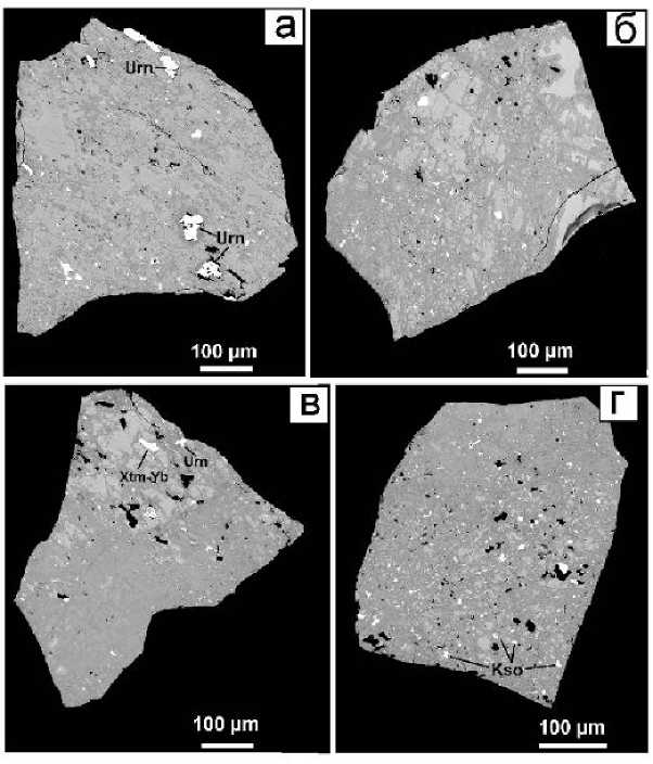 Fig. 3. Internal structure of zircons from pegmatite of the Mt Ploskaya deposit: а, б, в, г – zircon grains with gradual increase in intensity of alteration of primary zircon (light gray relics); a, б – uraninite inclusions (Urn) with dark gray halos of radiation alteration; в – flattened xenotime-(Yb) inclusions (Xtm-Yb); г – inclusions of “kasolite” (Kso) and quartz (black) in matrix. BSE images.