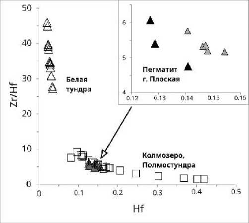 - По отношению Zr/Hf циркон из Плоскогорского пегматита сходен с высокогафниевым цирконом из LCT-пегматитов Кольского редкометалльного (Li-Be-Ta) пегматитового пояса.