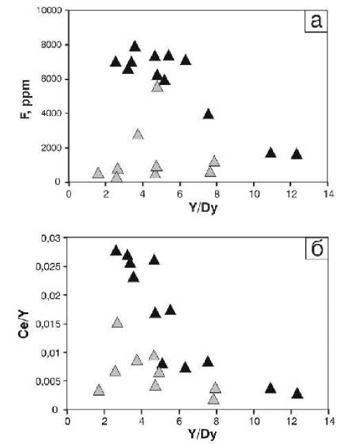 Рис. 7. Диаграммы F–Y/Dy и Ce/Y–Y/Dy для циркона из пегматита Плоскогорского месторождения, иллюстрирующие отрицательную корреляцию между содержанием F и отношением Y/Dy и увеличение содержаний Ce в минерале с понижением отношения Y/Dy (светло-серые треугольники – реликты; черные треугольники – матрица).