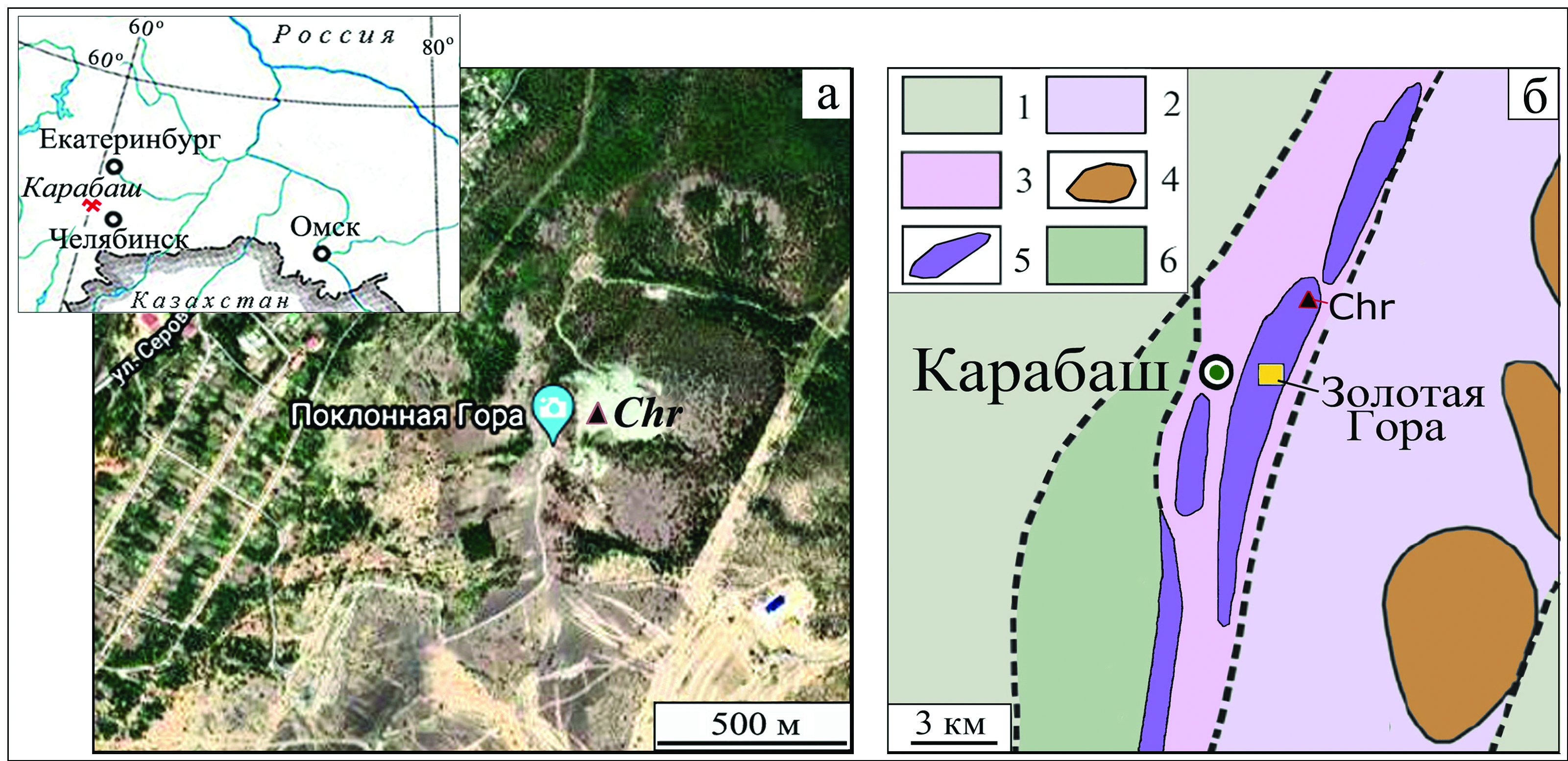 Рис. 1. Географическое положение хромитового карьера (Chr) на Поклонной Горе Карабашского массива (а) и геологическая схема района месторождения Золотая Гора (б). 1 – допалеозойские метаморфические породы зоны Уралтау, Уфалейский блок; 2 – допалеозойские метаморфические породы ильмено-вишневогорского комплекса; 3 – палеозойские вулканогенно-осадочные породы зоны ГУГР (O2); 4 – диориты, плагиограниты, гранодиориты (O2); 5 – метагипербазиты дунит-гарцбургитовой формации (O2); 6 – метагипербазиты дунит-верлит-клинопироксенит-габбровой формации (O3). Схема по Г.Г. Кораблёву и В.И. Ленных (Белогуб и др., 2003), с изменениями.