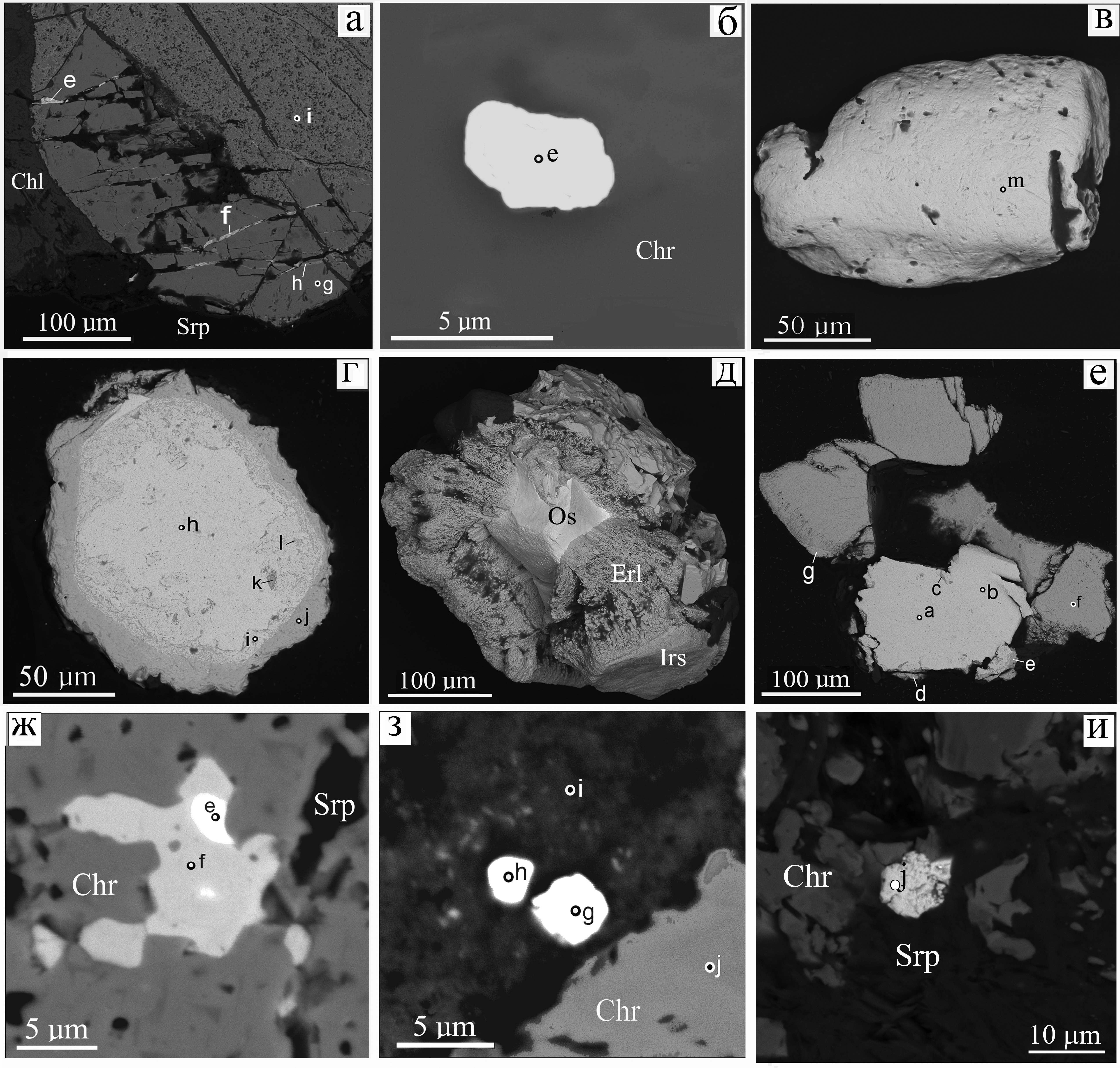 Рис. 5. Морфология самородных металлов и минералов благородных металлов: а – прожилки самородных железа (f) и никеля (e) в магнезиохромите (g); б – самородное золото (точка e в магнезиохромите (Chr)); в – изоферроплатина (m); г – иридий (h) с краевыми зонами самородного осмия (i), каймой ирарсита (j) и включениями купроиридсита (k) и толовкита (l); д – агрегат самородного осмия (Os), эрликманита (Erl) и ирарсита (Irs); е – сечение агрегата (д) с самородными иридием (a) и осмием (b), купроиридиситом (c), толовкитом (d), ирарситом (e, g) и эрликманитом (f); ж – лаурит (е) и миллерит (f) в магнезиохромите; з – эрликманит (h) и ирарсит (g) в серпентине с карбонатами (i); и – эрликманит (j) на контакте магнезиохромита и серпентина. Здесь и на рис. 8–11, BSE-фото.