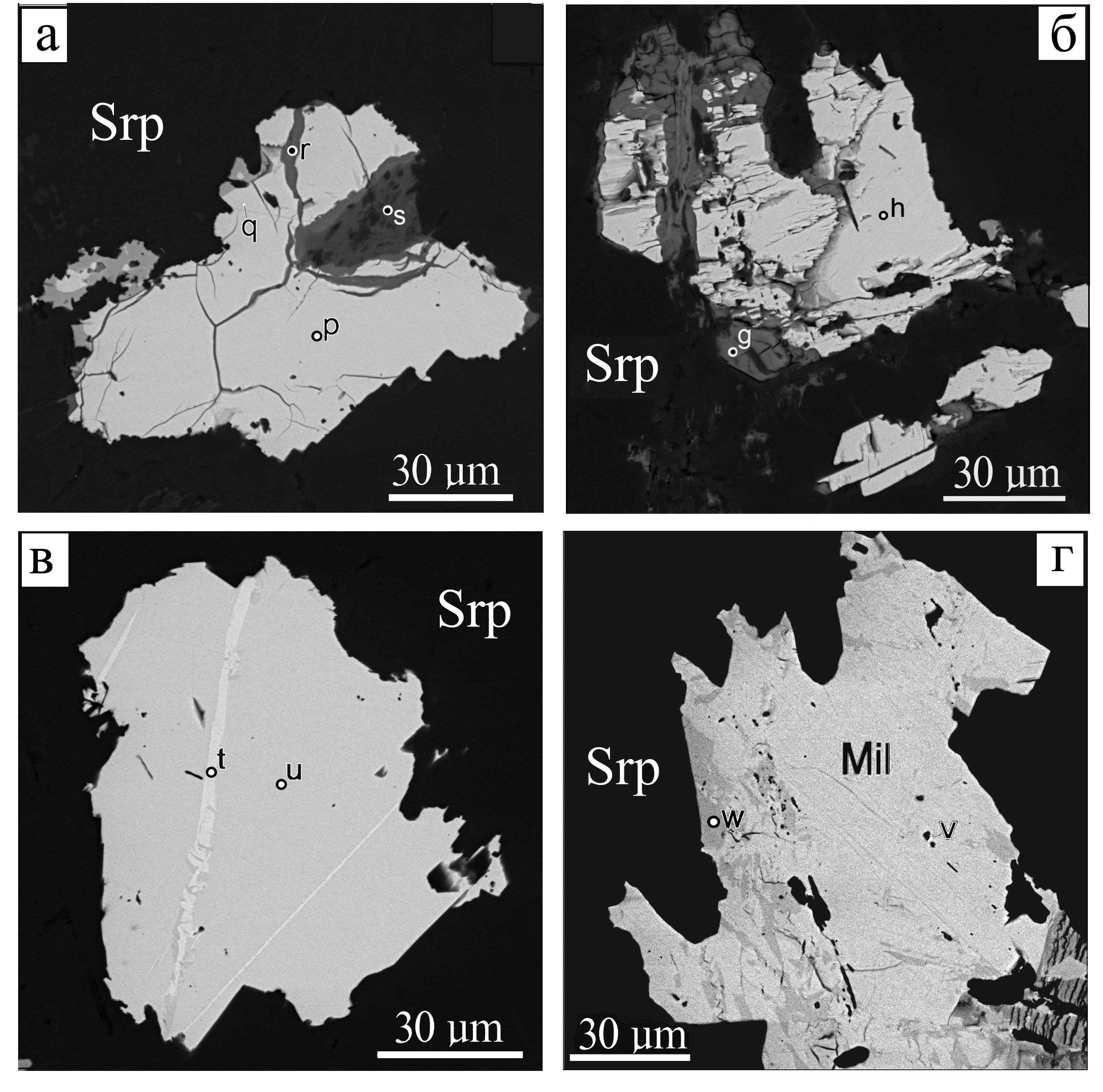 Fig. 8. Millerite (p, h, u) and associated minerals: a – naldrettite (q), nepuite (s) and paraotwayite (r); б – gaspeite (g); в – heazlewudite (t), г – sperrilite (v) and pentlandite (w).