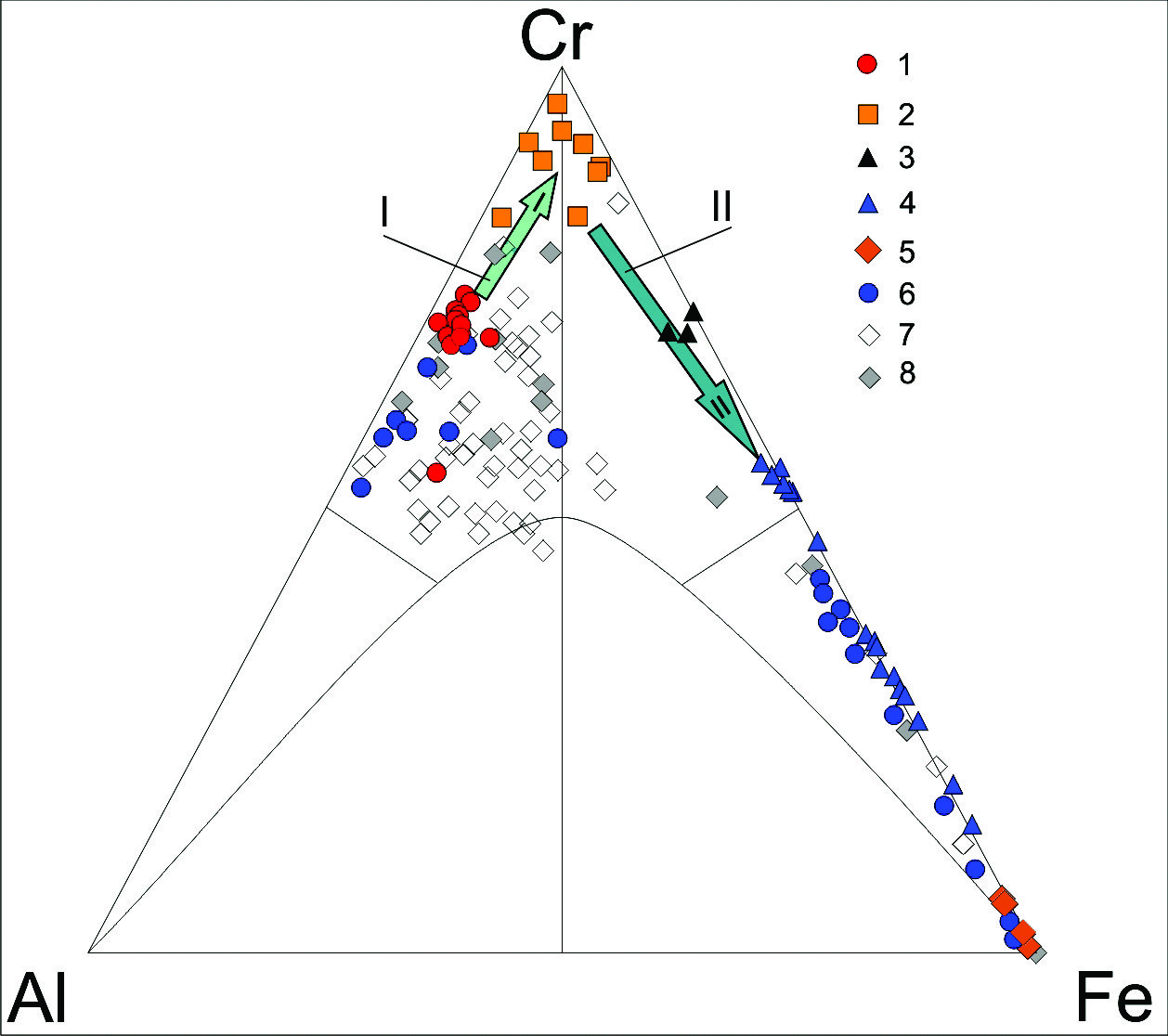 Рис. 12. Состав хромшпинелидов, хроммагнетита и магнетита (ат. %). 1–5 – образцы из хромитового карьера: 1 – хромит-1 (магнезиоалюмохромит); 2 – магнезиохромит, 3 – феррихромит; 4 – хроммагнетит, 5 – магнетит; 6 – Карабашский массив (Бажин и др., 2010); 7, 8 – рудные (7) и акцессорные (8) хромшпинелиды и магнетит Таловского массива (Бажин и др., 2010). Стрелками обозначены эволюционные тренды: I – магматический, II – метаморфический, связанный с серпентинизацией.