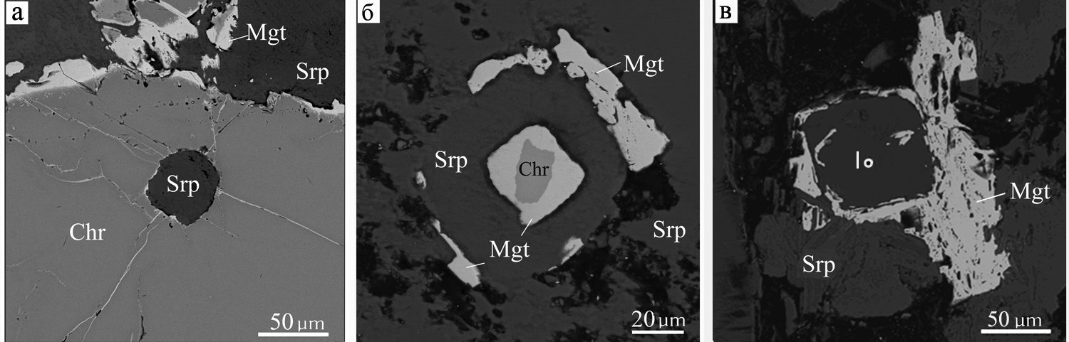 Взаимоотношения между магнезиохромитом и магнезиоалюмохромитом не всегда однозначны, но в большинстве сечений массивных хромититов магнезиохромит является более поздней фазой. Хромшпинелиды во вкрапленных рудах представлены как магнезиоалюмохромитом, так и магнезиохромитом. Обе эти разновидности могут содержать округлые включения серпентина, близкая к сферической форма которых указывает на их первичный расплавный характер, несмотря на то, что реликты первичных минералов в них не сохранились (рис. 13а). Иногда реликты магнезиохромита, замещенные хроммагнетитом, образуют включения в псевдоморфозах серпентина по оливину (?) или пироксену (рис. 13б), а сходные по морфологии серпентиновые псевдоморфозы находятся в агрегатах хроммагнетита, по-видимому, заместившего первичный хромит (рис. 13в). Наблюдаемые взаимоотношения минералов могут указывать на совместное образование первичных оливина, пироксена и хромшпинелидов из расплава. Общий тренд – замещение первично-магматических магнезиоалюмохромитов и магнезиохромитов феррихромитом и далее – хроммагнетитом и магнетитом установлен для многих древних гипербазитовых массивов из различных геодинамических обстановок (Costa, Barriga, 2022 и ссылки в этой статье) Магнезио-хромит содержит включения лаурита, хизлевудита, самородного золота. К контактам магнезиоалюмохромита и магнезиохромита часто приурочены зерна миллерита, в котором, в свою очередь, обнаружены включения сперрилита, налдреттита и хизлевудита.