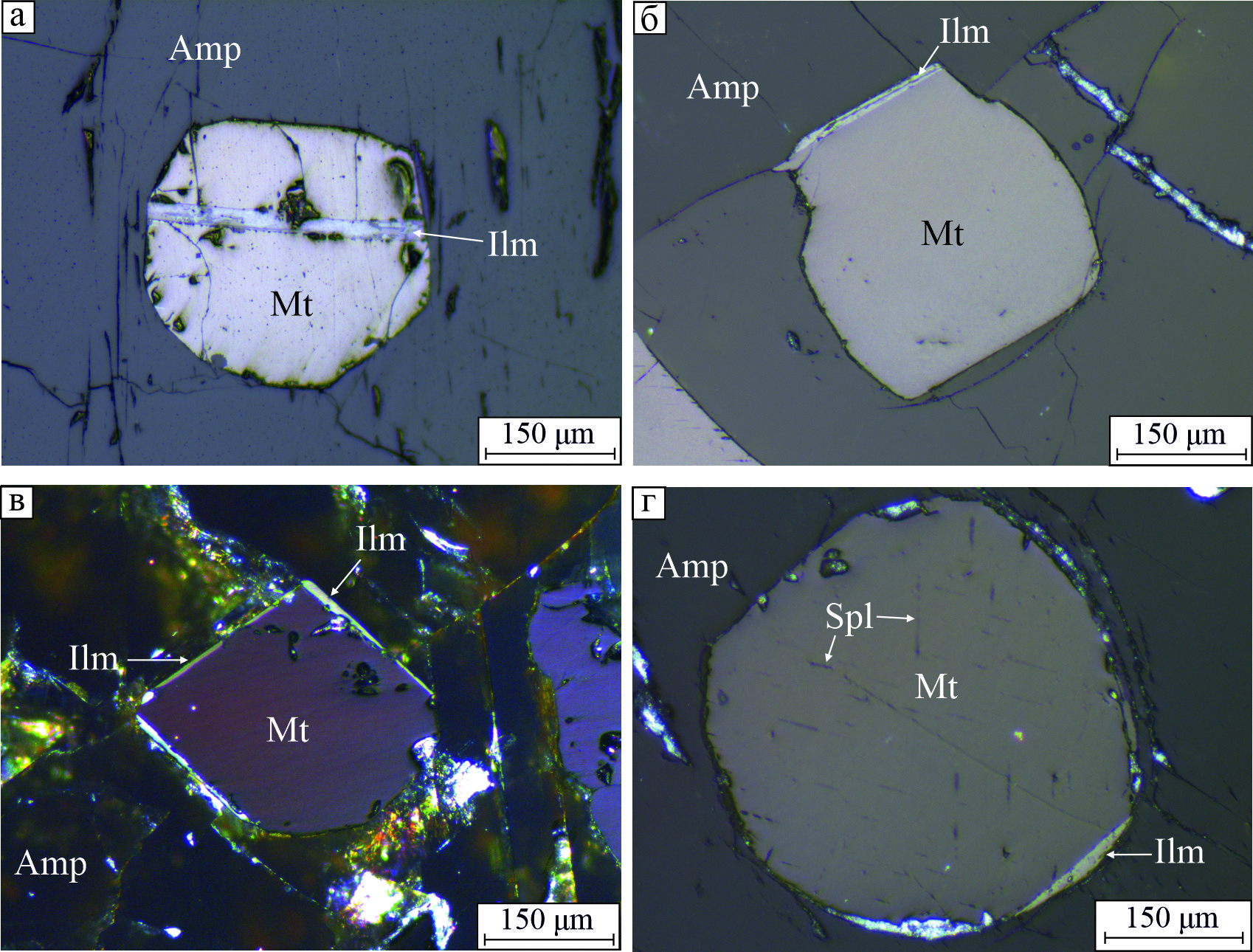 Ильменит в магнетите образует разнообразные по форме и размеру выделения, которые характеризуются закономерной ориентировкой относительно кристаллической структуры магнетита. Широко представлены отдельные пластинки ильменита толщиной первые десятки микрометров, которые по отношению к кристаллам магнетита могут располагаться в центральной части кристаллов (рис. 7а) или на границе магнетита с силикатами (рис. 7б), иногда обрамляя кристаллы магнетита практически со всех сторон (рис. 7в). В случае округлых выделений магнетита кристаллы ильменита часто имеют прямолинейные границы с магнетитом и округлые – с силикатами (рис. 7г).