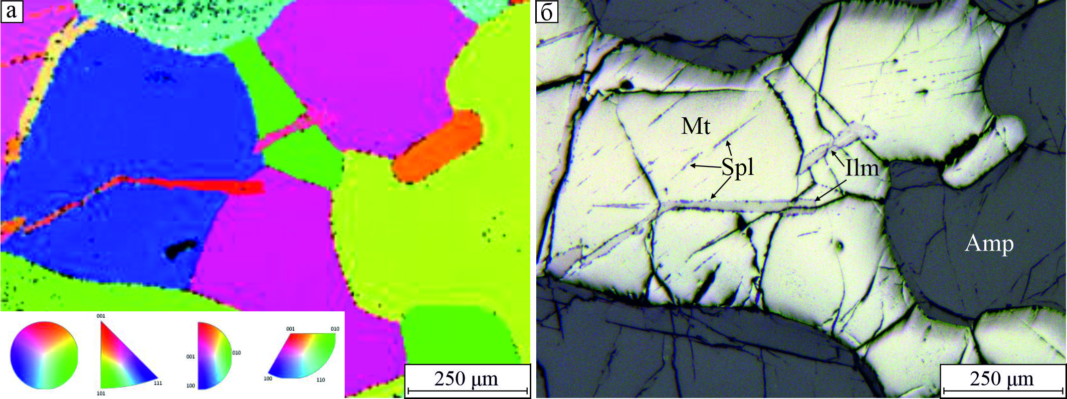 Ильменит в этих срастаниях обогащен Mn (2.45–6.63 мас. %), примесь которого не установлена во вмещающем магнетите. Небольшой размер (первые микрометры) выделений шпинели не позволяет точно определить ее состав в связи с влиянием на результаты анализа ильменита. Это отчетливо проявляется в пропорциональном росте содержаний TiO2 и MnO в шпинели, однако анализы ее наиболее крупных выделений размером до 6–10 мкм пересчитываются на формулу (Mg0.66 Fe2+0.34)1.00(Al1.99Fe3+0.01)2.00O4, соответствующую плеонасту. Пластинки ильменита могут располагаться не только в пределах монокристаллов магнетита, но и, сохраняя ориентировку, частично проникать в смежные зерна магнетита с другой кристаллической ориентировкой. Пересечение пластинчатыми кристаллами ильменита границ разноориентированных зерен магнетита фиксируется также методом дифракции обратно-рассеянных электронов (рис. 10).