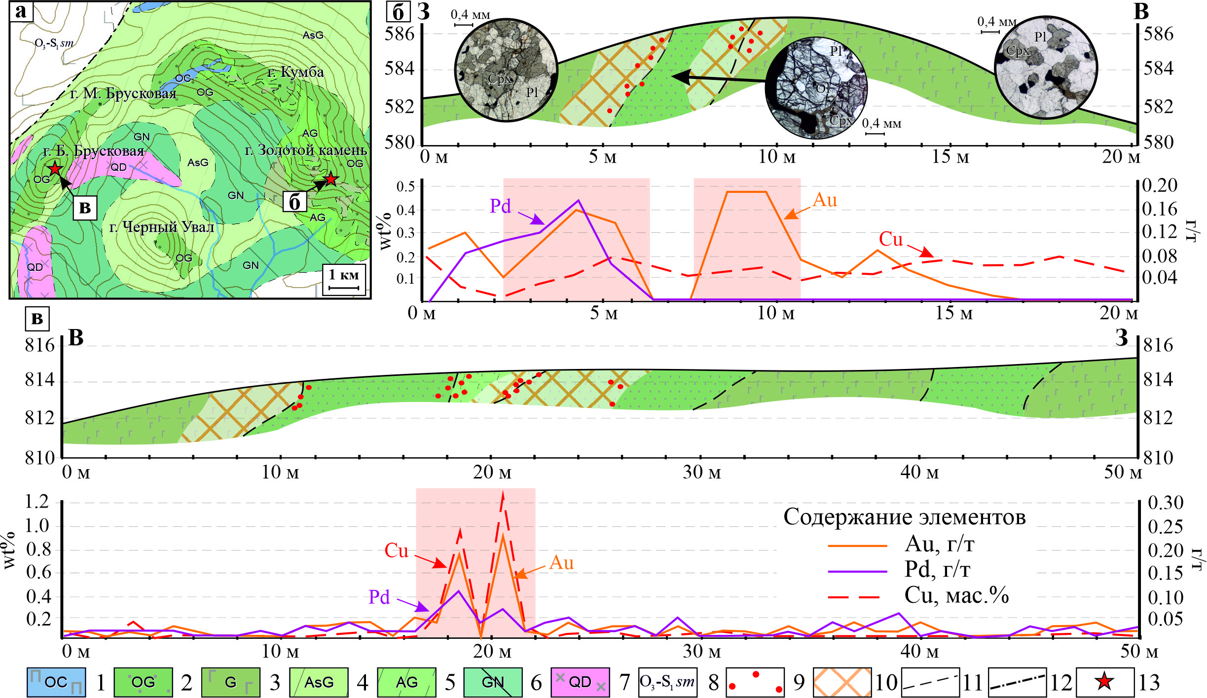 Fig. 2. Position of outcrops (a) of Mt. Zolotoy Kamen and Mt. Bolshaya Bruskovaya and their sketches (б, в) with Cu, Au and Pd contents of rocks. 1 – olivine pyroxenite; 2 – olivine gabbro; 3 – gabbro; 4 – amphibole-bearing gabbro; 5 – amphibole gabbro; 6 – gabbronorite; 7 – quartz gabbrodiorite; 8 – basalt of the Shemur Formation; 9 – visible inclusions of Cu sulfides in rocks; 10 – zones of taxitic rocks; 11 – inferred geological boundaries; 12 – faults; 13 – sampling sites.