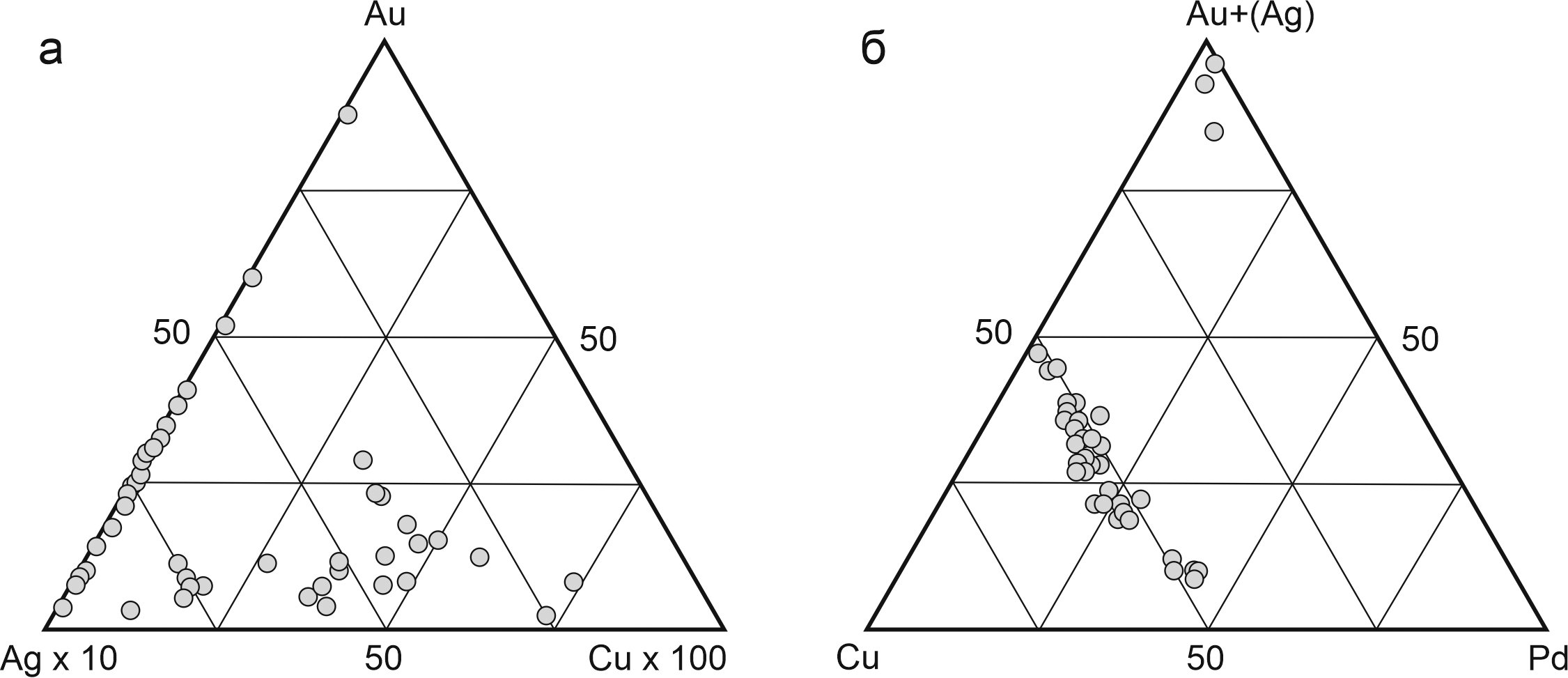 Рис. 4. Состав медистых (а) и палладистых (б) сплавов золота из габбро Кумбинского массива.