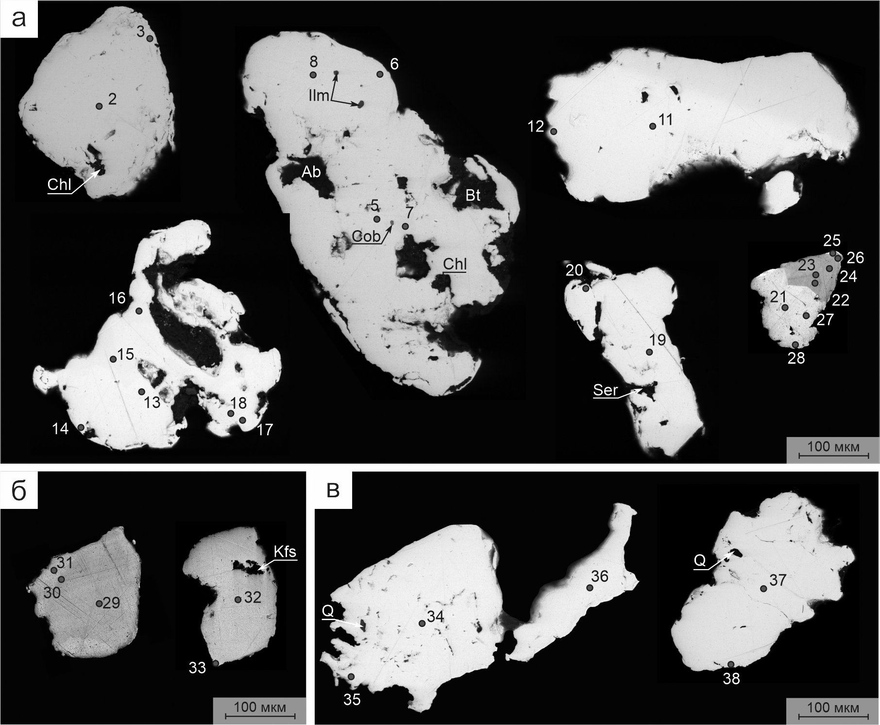 Рис. 7. Зерна золота из шлиховых проб девонских коренных делитифицированных конгломератов (а), четвертичных конгломератов (б) и современных аллювиальных отложений (в). Составы точек анализов приведены в табл. 2. BSE-фото.