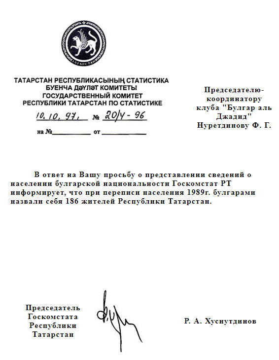 В этом же контексте в 1988 году в Казани было создано общество «Булгар аль-Джадид». На одном из своих митингов в Казани общество приняло обращение к руководству республики о переименовании татар в булгар и развило общественную деятельность по актуализации этой идеи в республиканских СМИ, провело съезд Булгарского национального конгресса и создало свои ячейки в некоторых местах проживания татар за пределами Татарстана. В риторике сторонников переименования Татарстана в «Булгар иле» («Булгаристан») использовался и актуальный тезис национального движения того времени о независимости Татарстана. Одним из итогов массированной пропаганды «булгаризации» татар стали результаты переписи населения 1989 г. По этим данным, булгарами записались 186 человек, но и те в конечном итоге в переписных документах попали, вероятно, в графу «другие или прочие», так как, по официальным данным госкомитета РТ по статистике в 1989–2010 г., булгары в переписях населения не зафиксированы. Таким образом, они «ушли» от татар, но пришли в «никуда»… [6].
