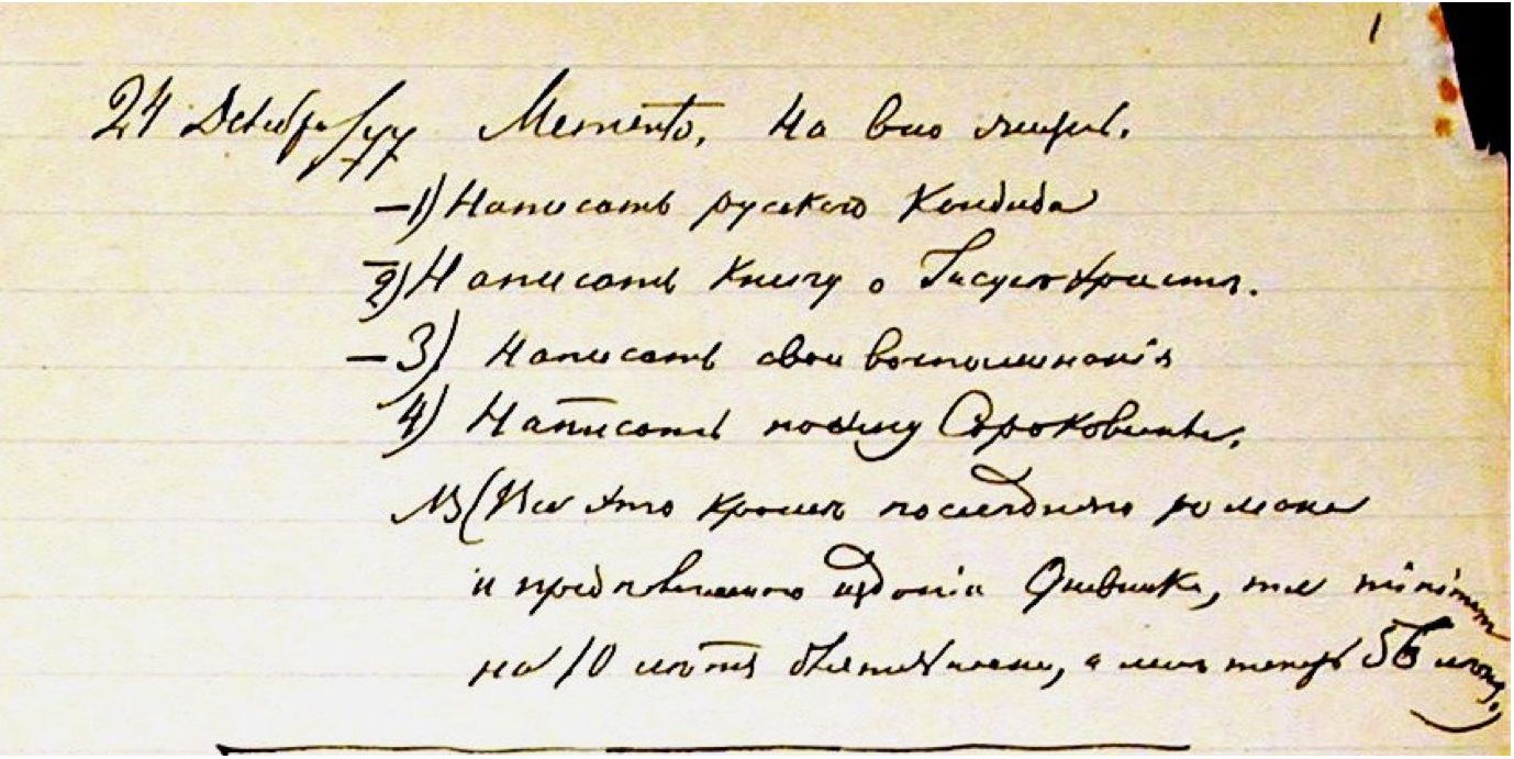 Fig. 5. Sketches of Dostoevsky’s unrealized creative plans dated December 24, 1877