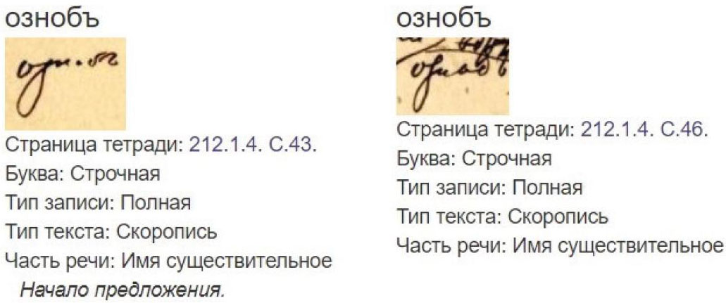 Список проанализированных графем отражается в Библиотеке графических образцов, где через поисковую строку можно найти образец почерка, набрав слово по первым буквам или полностью (см. Илл. 1). Примеры включают словоформы (при их наличии), что дает наглядную картину различных написаний одного и того же слова в одной или разных грамматических позициях, со строчной буквы и с прописной, карандашом или пером (чернилами).