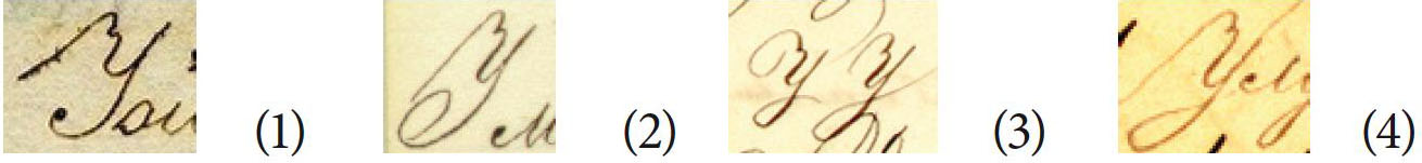 The capital letter “У” in 1854 Dostoevsky’s manuscript (1, 2) and in the cursive workbooks of the 1830–1850s (3, 4)