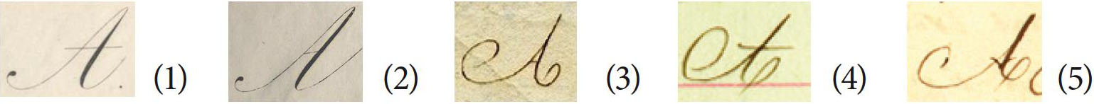 The capital letter “A” in the cursive workbooks (1, 2), in 1854 Dostoevsky’s manuscript (3) and in his notebook (4, 5)