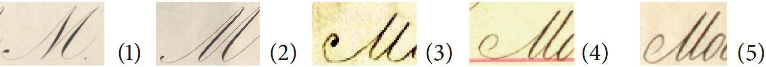 The capital letter “М” in the cursive workbooks (1, 2), in 1854 Dostoevsky’s manuscript (3) and in his notebooks 1830–1850s (4, 5)